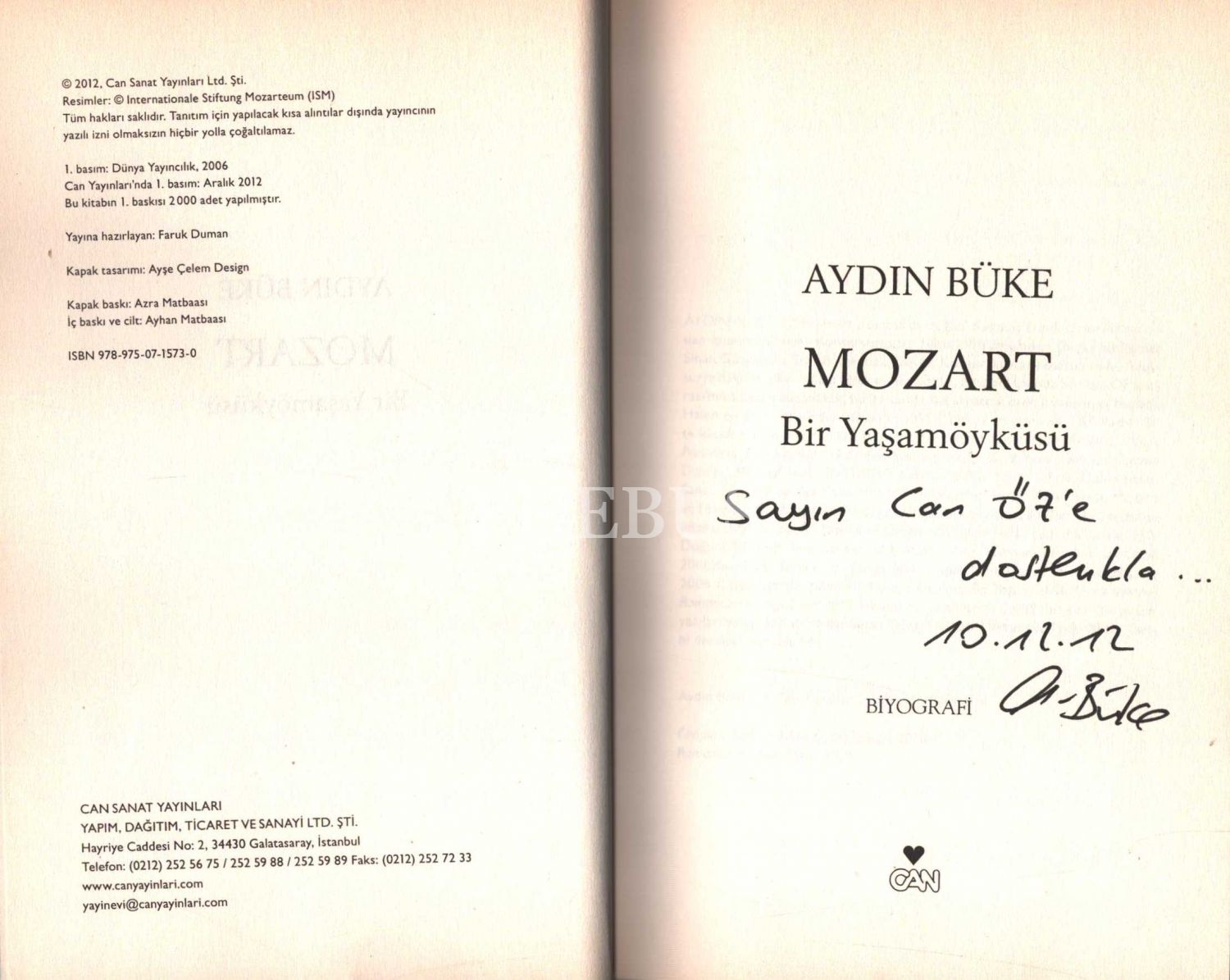 Aydın Büke´den Can Öz'e ithaflı ve imzalı MOZART (Bir Yaşamöyküsü), Can Yayınları, Aralık 2012, 331 sayfa, 15x23 cm