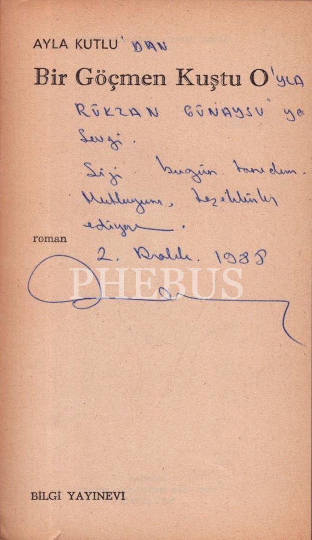 Ayla Kutlu´dan Rükzan Güneysu'ya ithaflı ve imzalı BİR GÖÇMEN KUŞTU O, Bilgi Yayınevi, Temmuz 1986, 246 sayfa, 11x19 cm