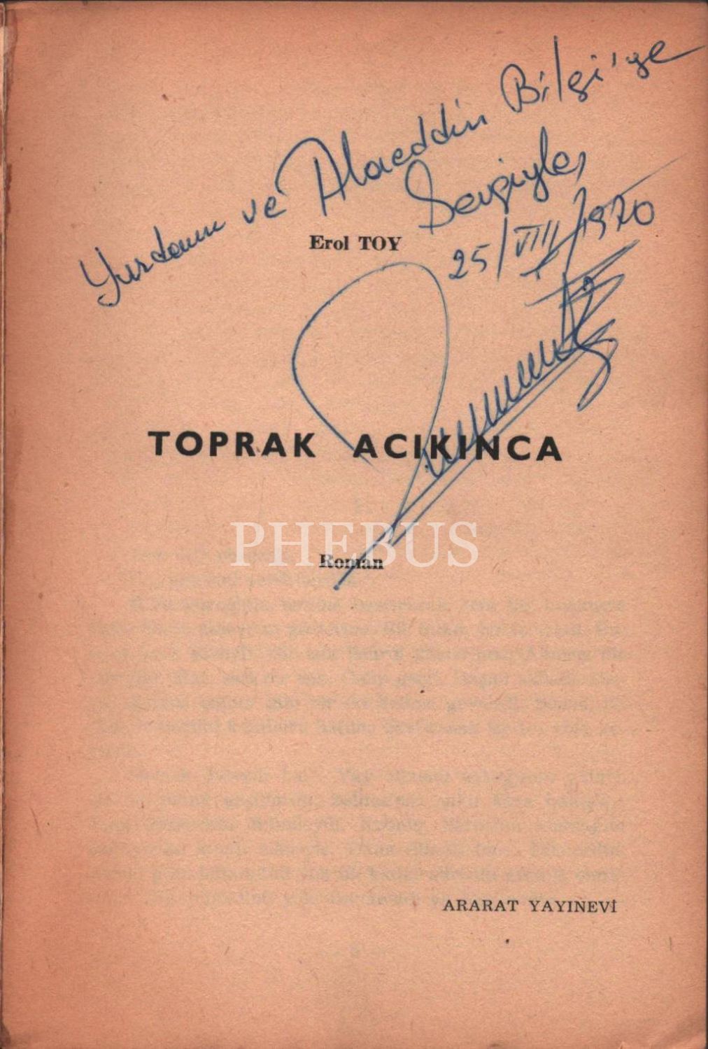 Erol Toy´dan ithaflı ve imzalı TOPRAK ACIKINCA (Roman), Ararat Yayınevi, İstanbul - 1968, 477 sayfa, 13x20 cm