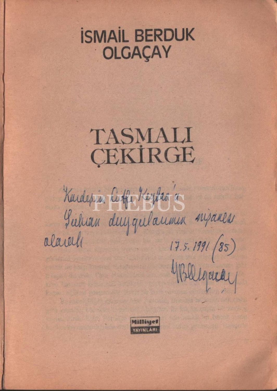İsmail Berduk Olgaçay´dan ithaflı ve imzalı TASMALI ÇEKİRGE, Milliyet Yayınları, Mart 1990, 505 sayfa, 14x19 cm
