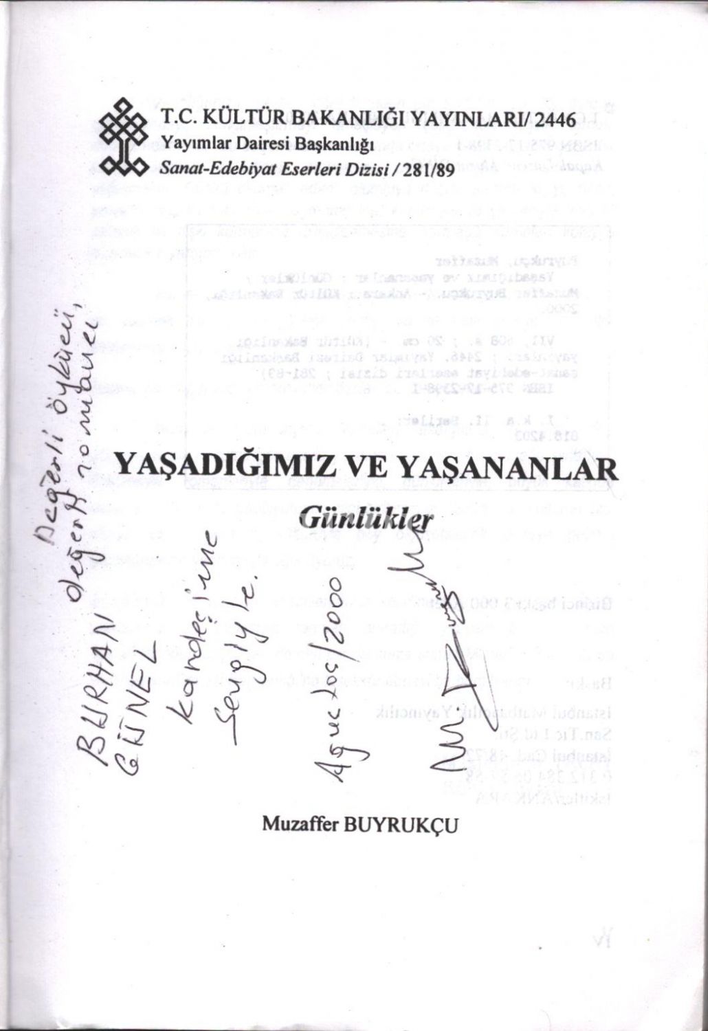 Muzaffer Buyrukçu´dan Burhan Günel´e ithaflı ve imzalı YAŞADIĞIMIZ VE YAŞANANLAR (Günlükler), T.C. Kültür Bakanlığı Yayınları, 2000, 608 sayfa, 14x20 cm