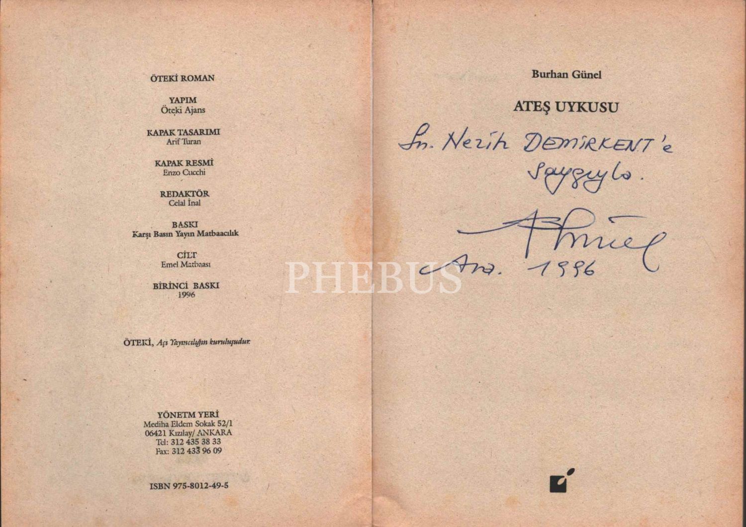 Burhan Günel´den Nezih Demirkent´e ithaflı ve imzalı ATEŞ UYKUSU, Öteki Roman, 1996, 308 sayfa, 14x20 cm