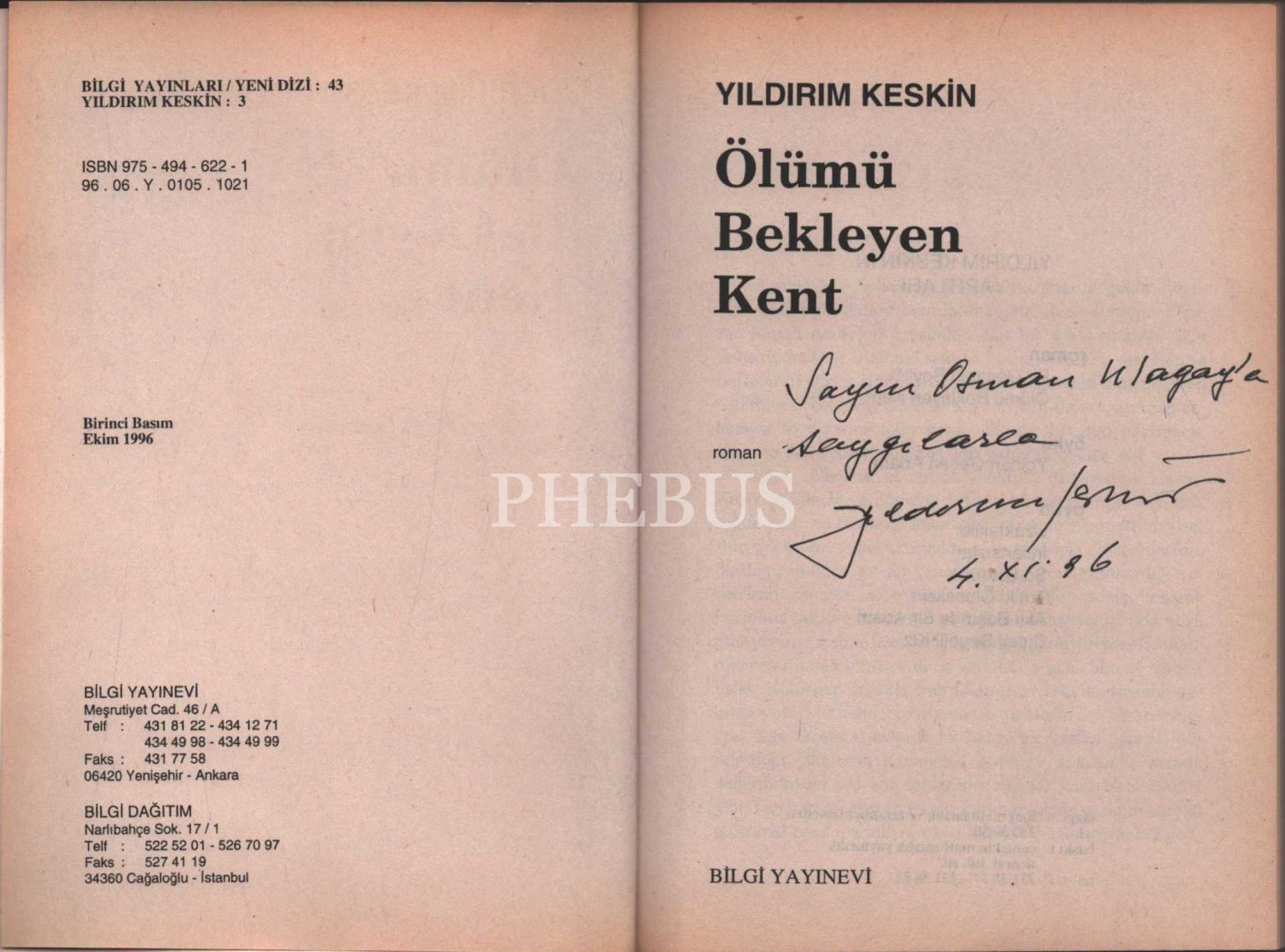 Yıldırım Keskin´den Osman Ulagay´a ithaflı ve imzalı ÖLÜMÜ BEKLEYEN KENT (Roman), Bilgi Yayınevi, Ekim 1996, 196 sayfa, 14x20 cm