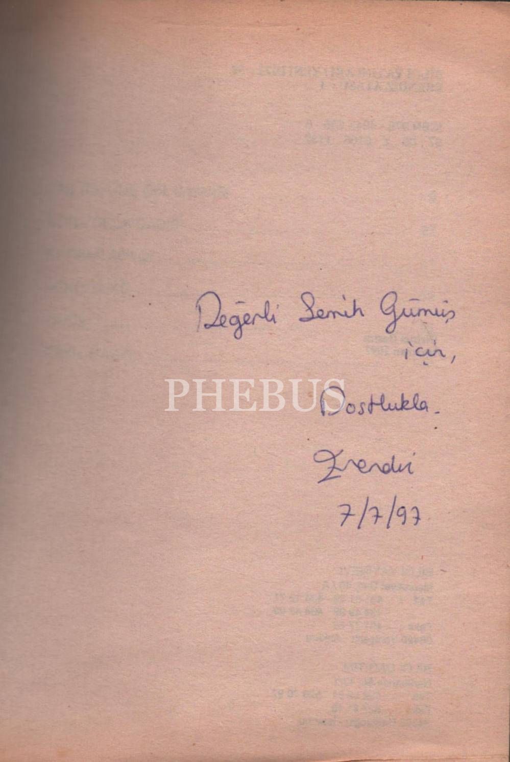 İthaf, "Değerli Semih Gümüş için, dostlukla. Erendiz. 7/7/97" şeklindedir.