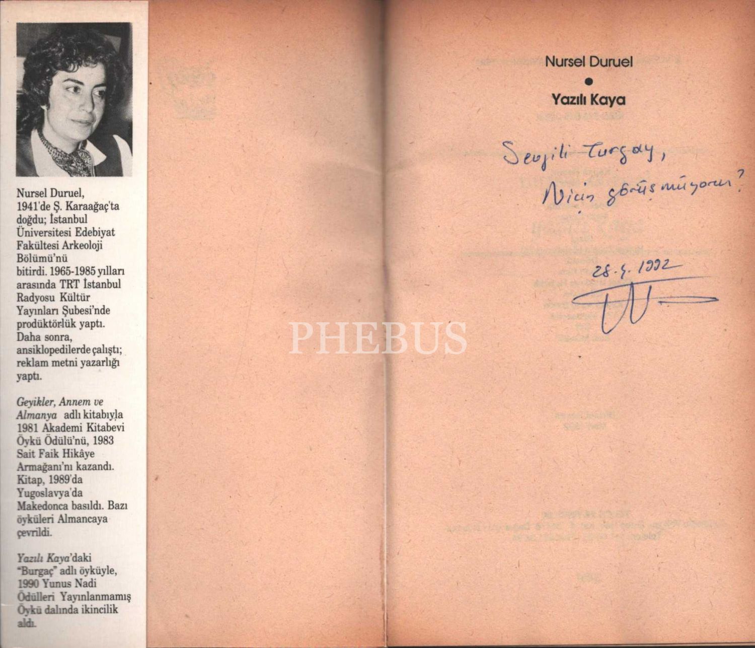 Nursel Duruel´den Turgat Fişekçi'ye ithaflı ve imzalı YAZILI KAYA, Telos Yayıncılık, Mart 1992, 79 sayfa, 12x20 cm
