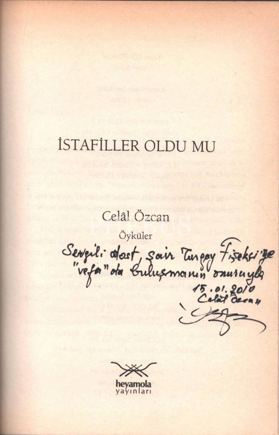 Celâl Özcan´dan Turgay Fişekçi´ye ithaflı ve imzalı İSTAFİLLER OLDU MU (Öyküler), Heyamola Yayınları, Ocak 2010, 221 sayfa, 14x20 cm