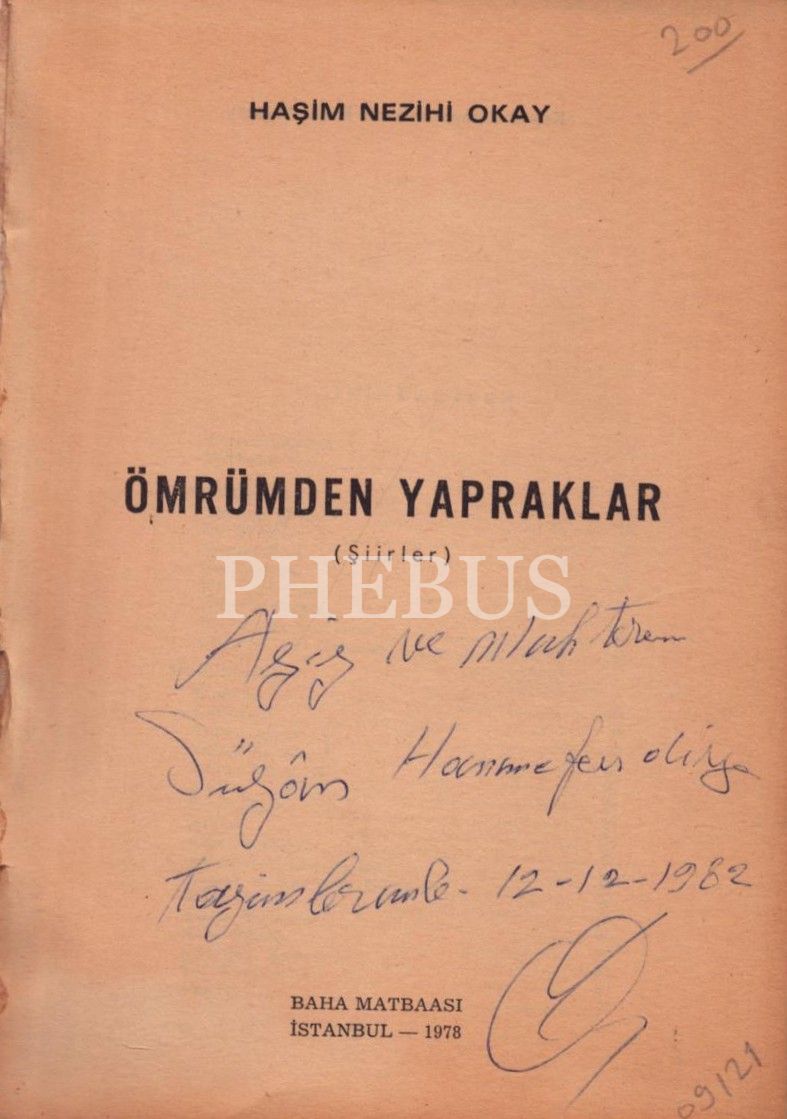 Haşim Nezihi Okay´dan ithaflı ve imzalı ÖMRÜMDEN YAPRAKLAR (Şiirler), Baha Matbaası, İstanbul - 1978, 184 sayfa, 14x20 cm