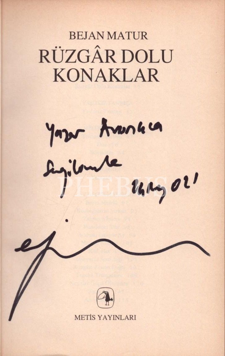 Bejan Matur´dan Yaşar Avunç'a ithaflı ve imzalı RÜZGÂR DOLU KONAKLAR, Metis Yayınları, Mayıs 1999, 114 sayfa, 14x20 cm