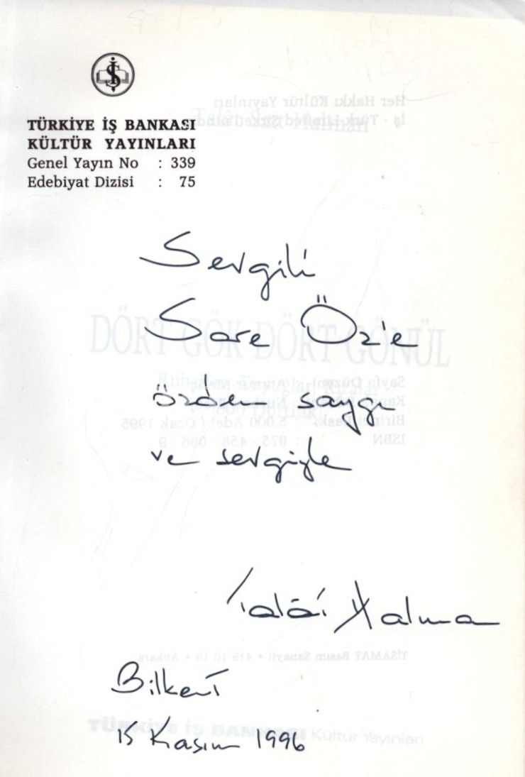 İthaf, "Sevgili Sare Öz´e özden saygı ve sevgiyle. Talât Halman. Bilkent 15 Kasım 1996" şeklindedir.