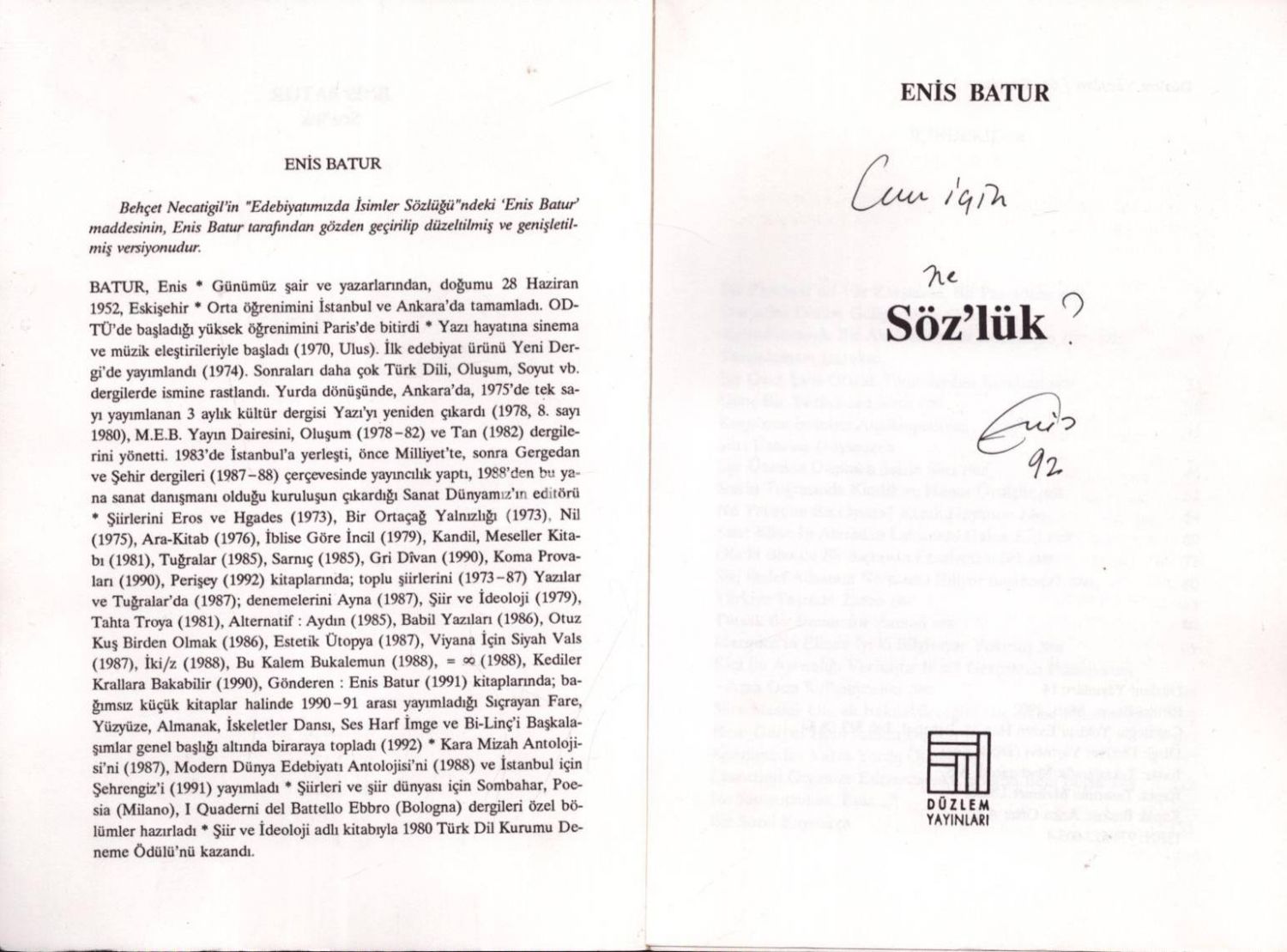 Enis Batur´dan ithaflı ve imzalı SÖZ´LÜK, Düzlem Yayınları, Mart 1992, 153 sayfa, 14x20 cm