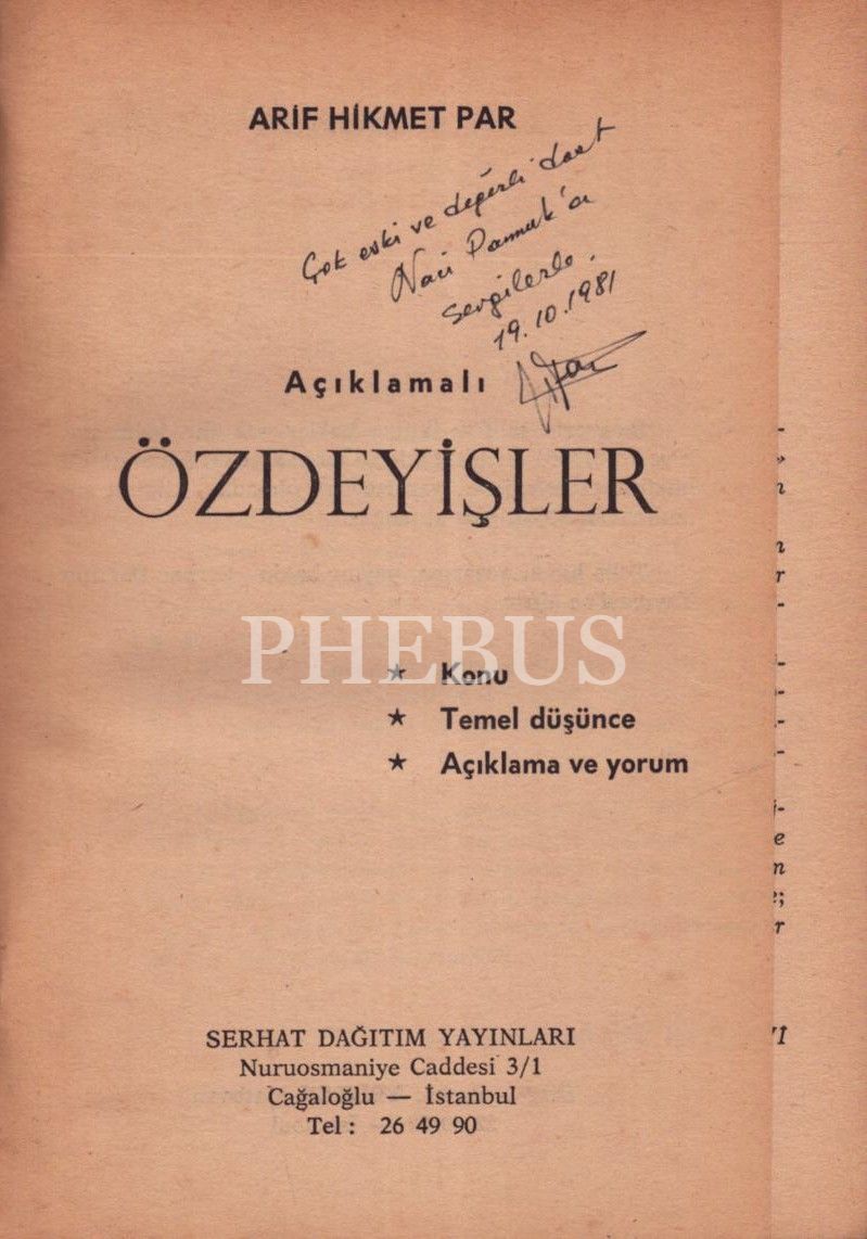İthaf, "Çok eski ve değerli dost Naci Pamuk´a sevgilerle. 19.10.1981 H. Par" şeklindedir.