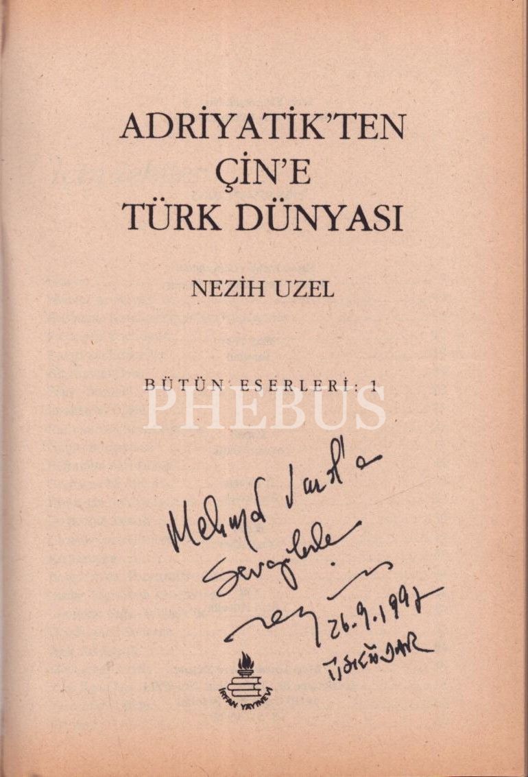 Nezih Uzel´den ithaflı ve imzalı ADRİYATİK´TEN ÇİN´E TÜRK DÜNYASI, İrfan Yayınevi, İstanbul - Mart 1993, 247 sayfa, 14x20 cm