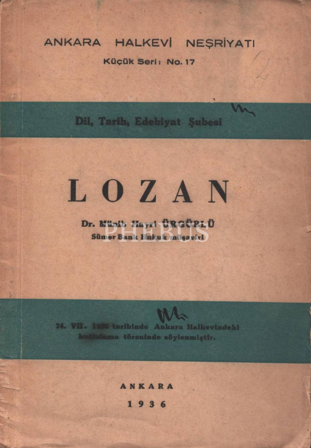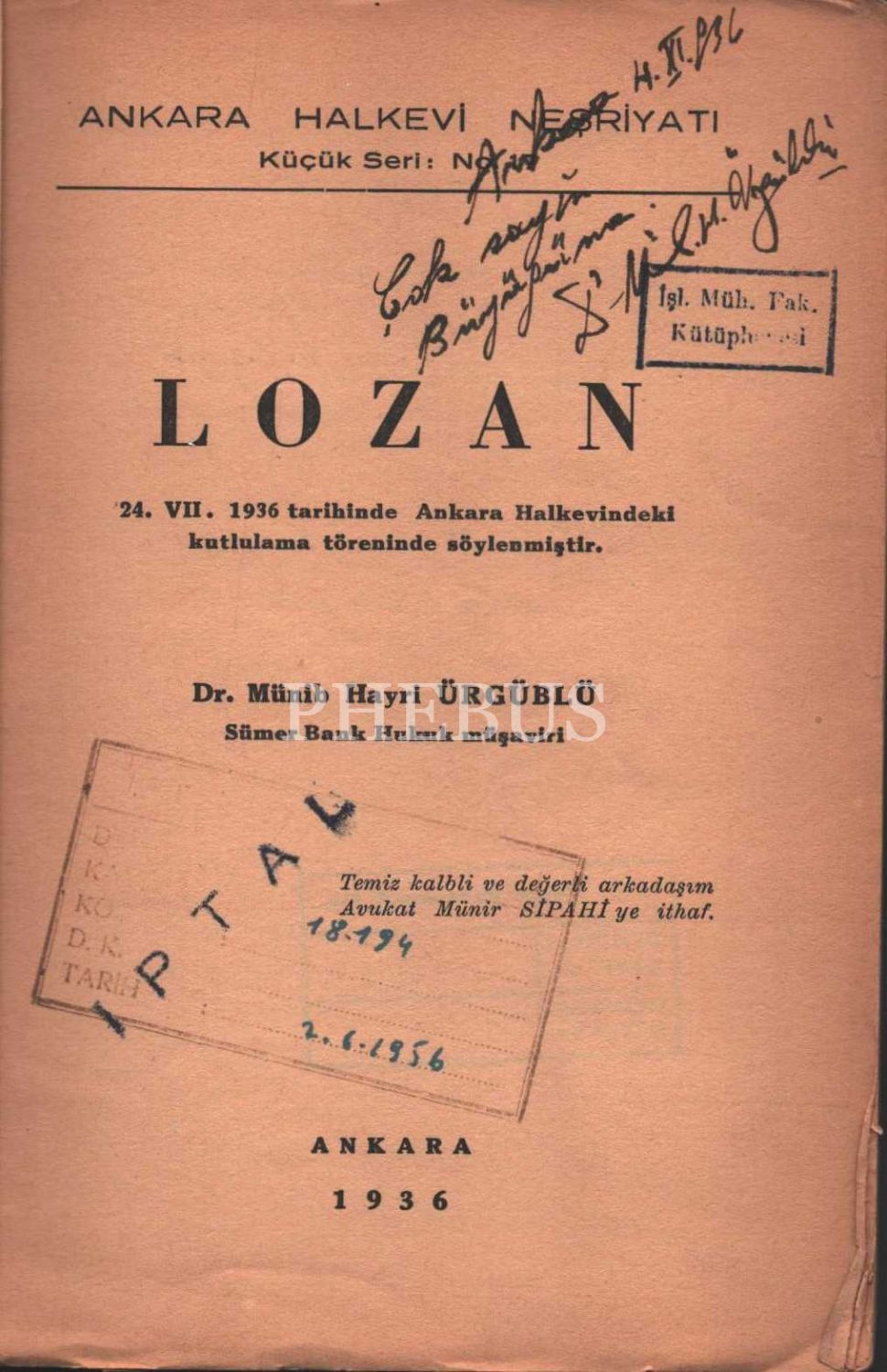 Münib Hayri Ürgüblü´den ithaflı ve imzalı LOZAN (24.VII.1936 Tarihinde Ankara Halkevindeki Kutlulama Töreninde Söylenmiştir), Ankara - 1936, 27 sayfa, 14x20 cm