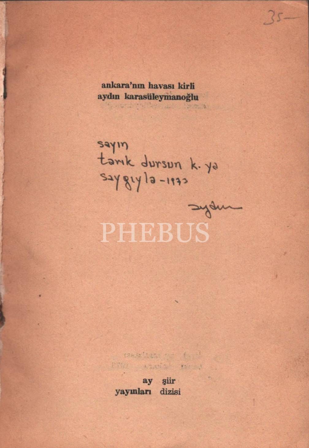 Aydın Karasüleymanoğlu´ndan Tarık Dursun K.´ya ithaflı ev imzalı ANKARA´NIN HAVASI KİRLİ (Şiirler), Ay Yayınları, Ankara - 1973, 64 sayfa, 14x19 cm
