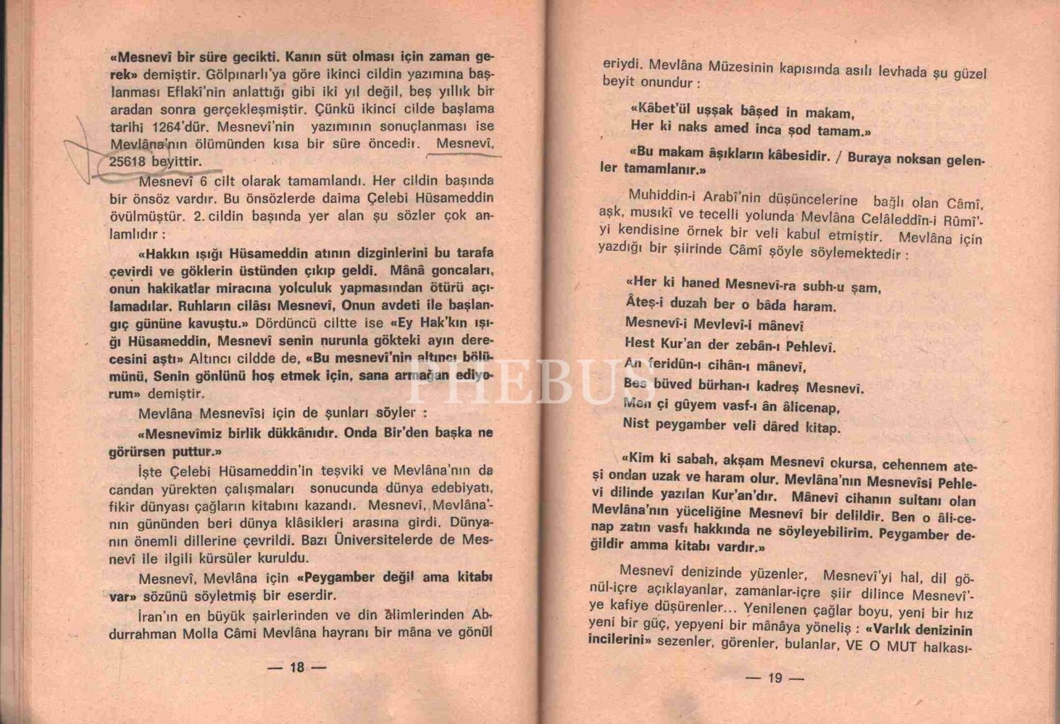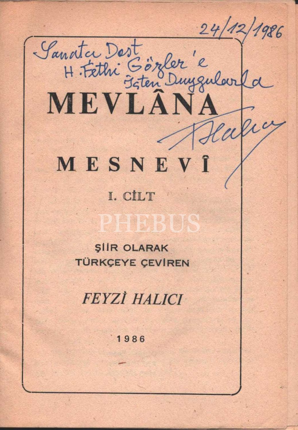 Feyzi Halıcı´dan ithaflı ve imzalı MEVLANA MESNEVİ [1. Cilt], Arı Basımevi, Konya - 1986, 336 sayfa, 14x20 cm