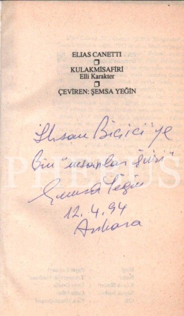 Şemsa Yeğin´den ithaflı ve imzalı KULAKMİSAFİRİ ELLİ KARAKTER, Elias Canetti, Payel Yayınları, İstanbul - 1994, 143 sayfa, 11x18 cm
