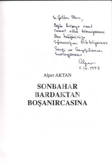 Alper Aktan´dan Gülten Akın'a ithaflı ve imzalı SONBAHAR BARDAKTAN BOŞANIRCASINA, Toplımsal Dönüşüm Yayınları, 53 sayfa, 14x20cm