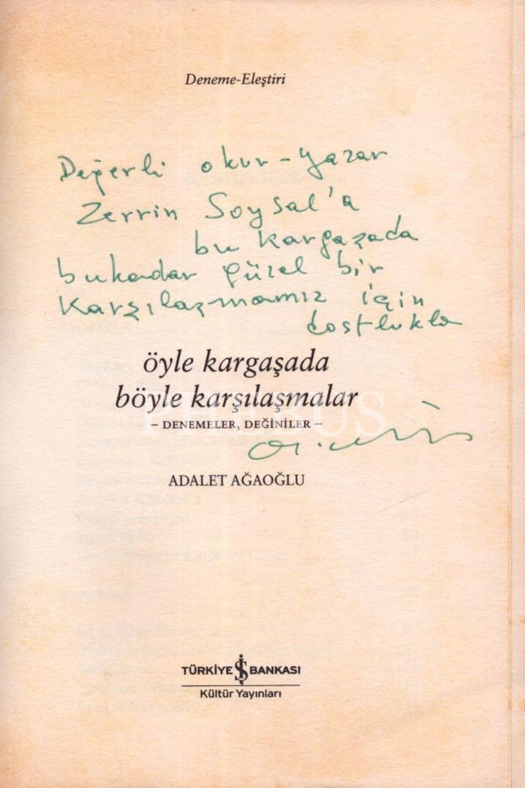 Adalet Ağaoğlu´dan Zerrin Soysal´a ithaflı ve imzalı ÖYLE KARGAŞADA BÖYLE KARŞILAŞMALAR, Türkiye İş Bankası Kültür Yayınları, İstanbul - 2008, 213 sayfa, 13x20 cm