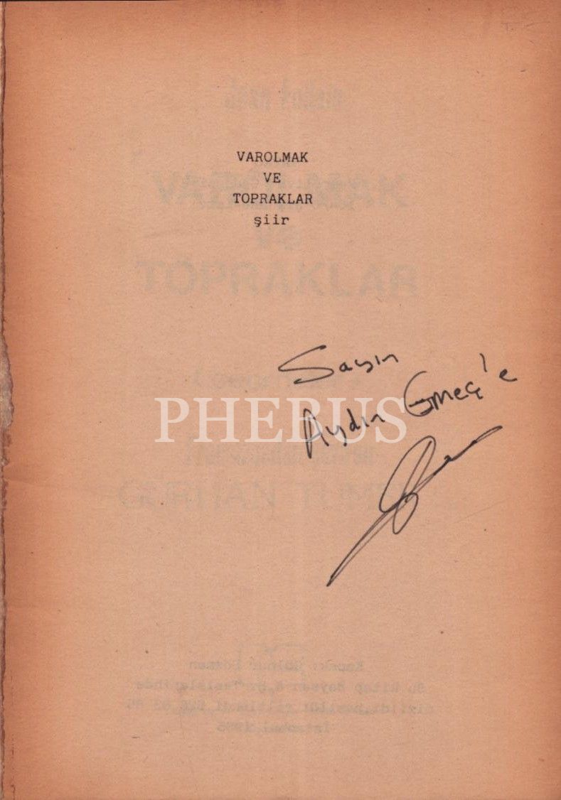 Çevirmen Gürhan Tümer´den Aydın Emeç'e ithaflı ve imzalı VAROLMAK VE TOPRAKLAR, Jean Follain, Yazarlar ve Çevirmenler Üretim Kooperatifi, İstanbul - 1985, 68 sayfa, 13x20 cm