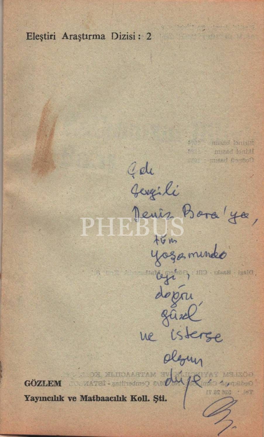 İthaf; "Sevgili Deniz Bora´ya tüm yaşamında iyi, doğru, güzel ve isterse olgun düze.." şeklindedir.