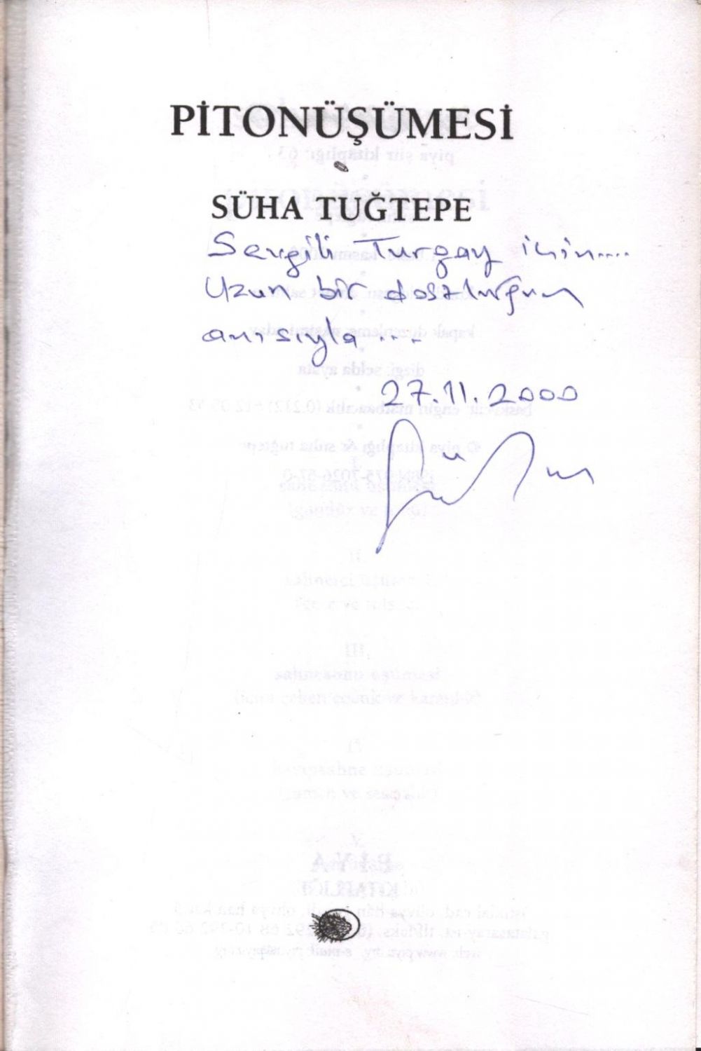 Süha Tuğtepe´den Turgay Fişekçi'ye ithaflı ve imzalı PİTONÜŞÜMESİ, Piya Kitaplığı, İstanbul - 2000, 76 sayfa, 13x20 cm