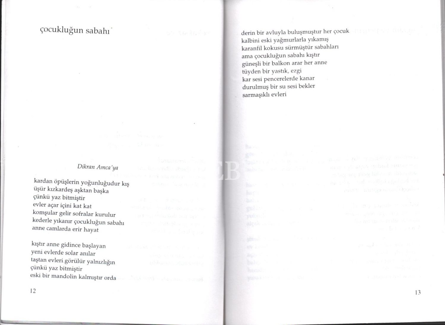 İthaf; "Sevgili Sezai Sarıoğlu´na Kardan Harfler´in güzelliğiyle" şeklindedir.