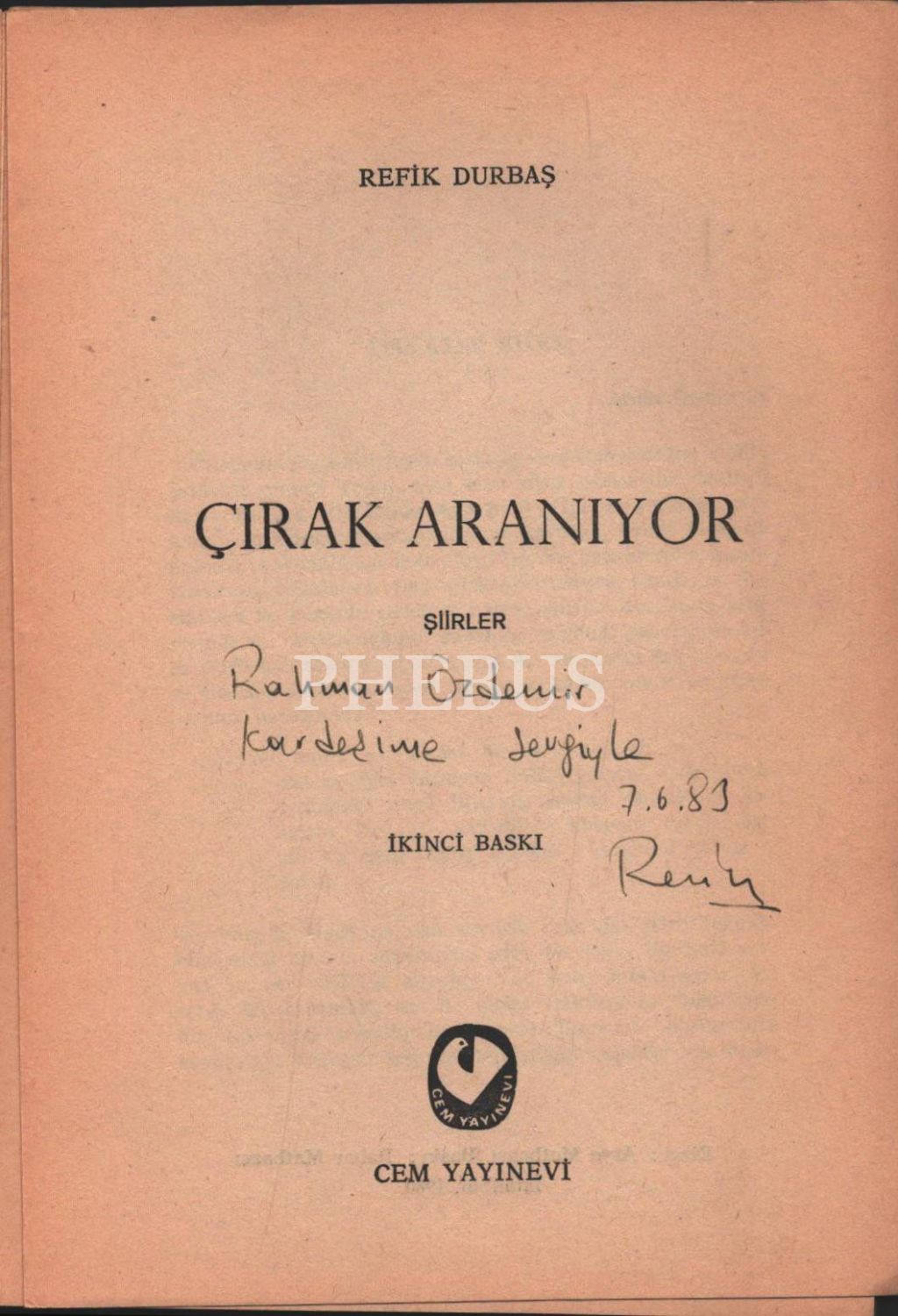 Refik Durbaş´tan ithaflı ve imzalı ÇIRAK ARANIYOR, Bahar Matbaası, İstanbul - 1980, 91 sayfa, 14x20 cm
