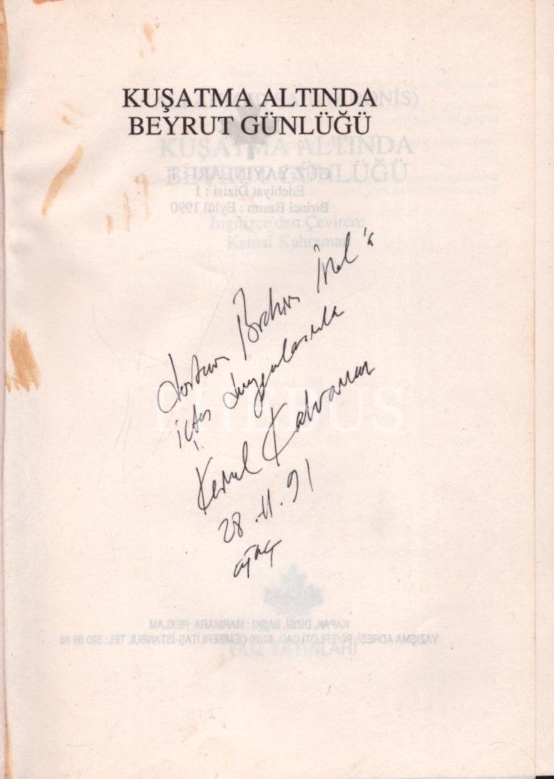 Kitabın çevirmeni Kemal Kahraman´dan ithaflı ve imzalı KUŞATMA ALTINDA BEYRUT GÜNLÜĞÜ, Ali Ahmed Said, Güz Yayınları, İstanbul - 1990, 79 sayfa, 13x19 cm
