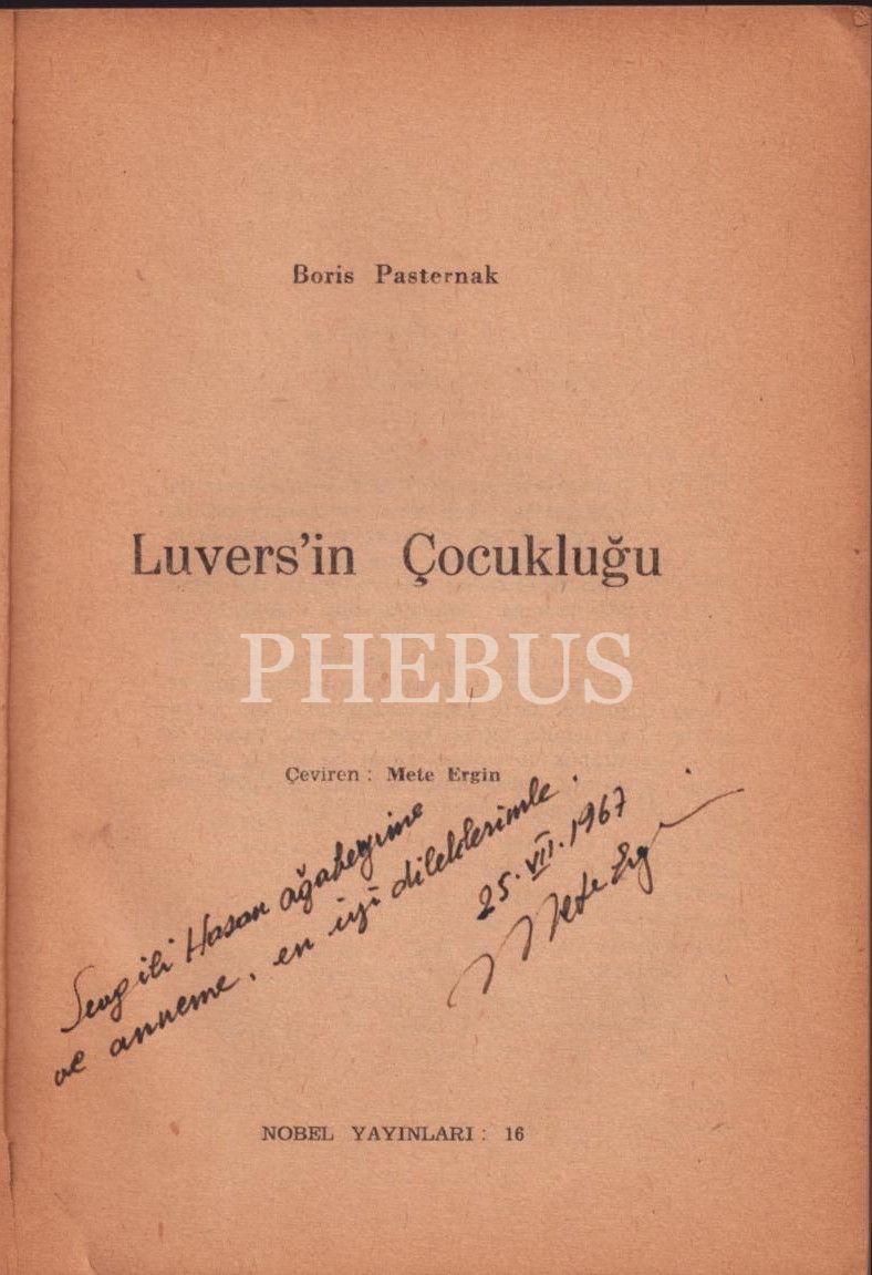 Kitabın çevirmeni Mete Ergin´den ithaflı ve imzalı LUVERS´iN ÇOCUKLUĞU VE SON YAZ, Boris Pasternak, Hüsnitabiat Matbaası, İstanbul - 1967, 176 sayfa, 14x19 cm