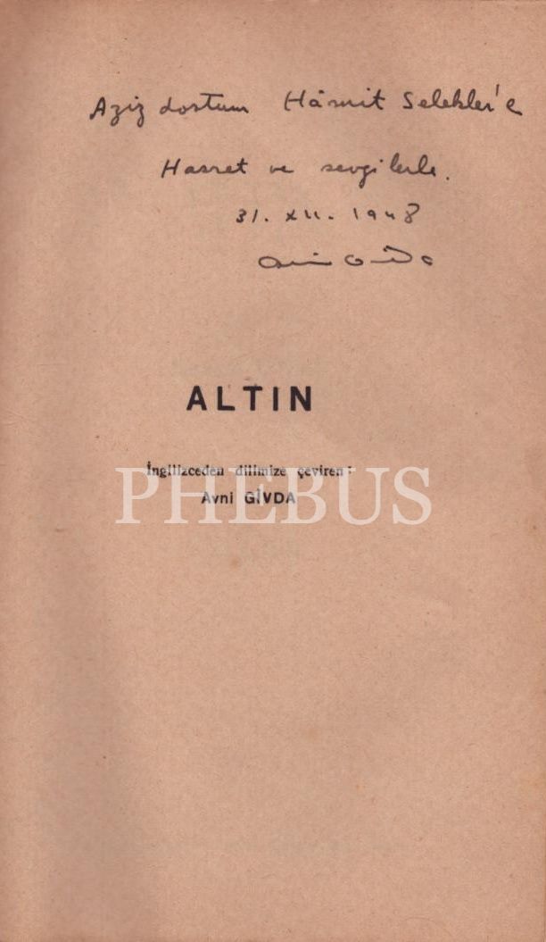 Çevirmen Avni Givda´dan Hamit Selekler´e ithaflı ve imzalı ALTIN, Eugene O´Neil, Milli Eğitim Bakanlığı Devlet Konservatuvarı Yayımları, İstanbul - 1947, 134 sayfa, 12x18 cm