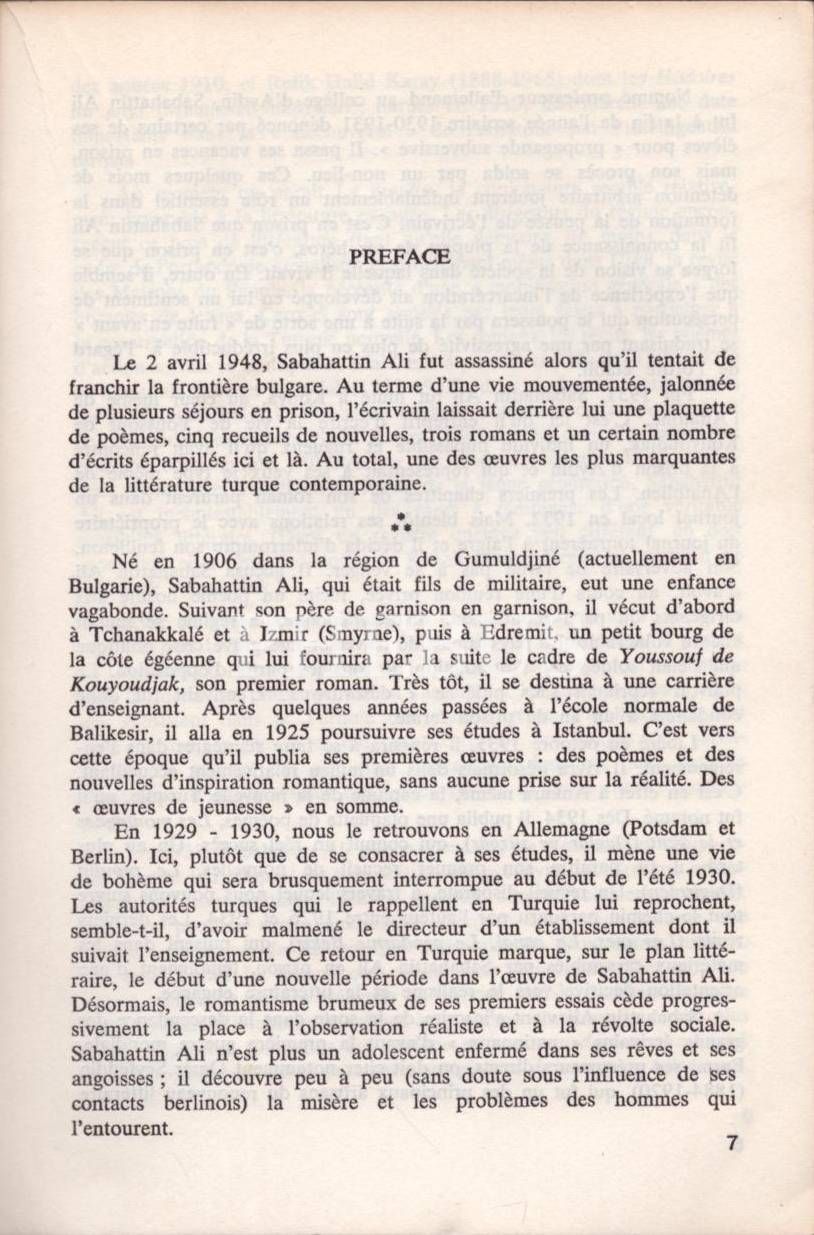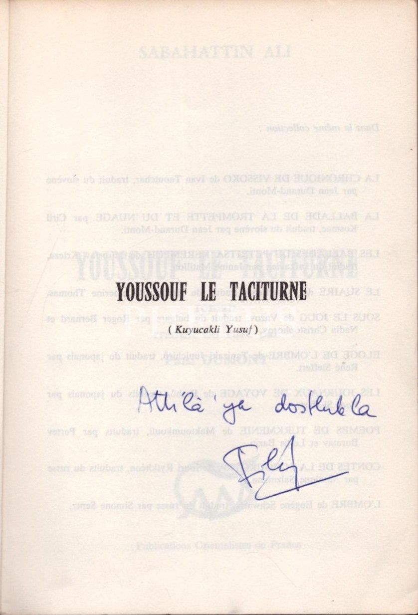 Filiz Ali´den Atilla Özkırımlı´ya ithaflı ve imzalı YOUSSOUF LE TACİTURNE [Kuyucaklı Yusuf], Sabahattin Ali, çeviren: Paul Dumont, Publications Orientalistes de France, 1977, 231 sayfa, 14x21 cm