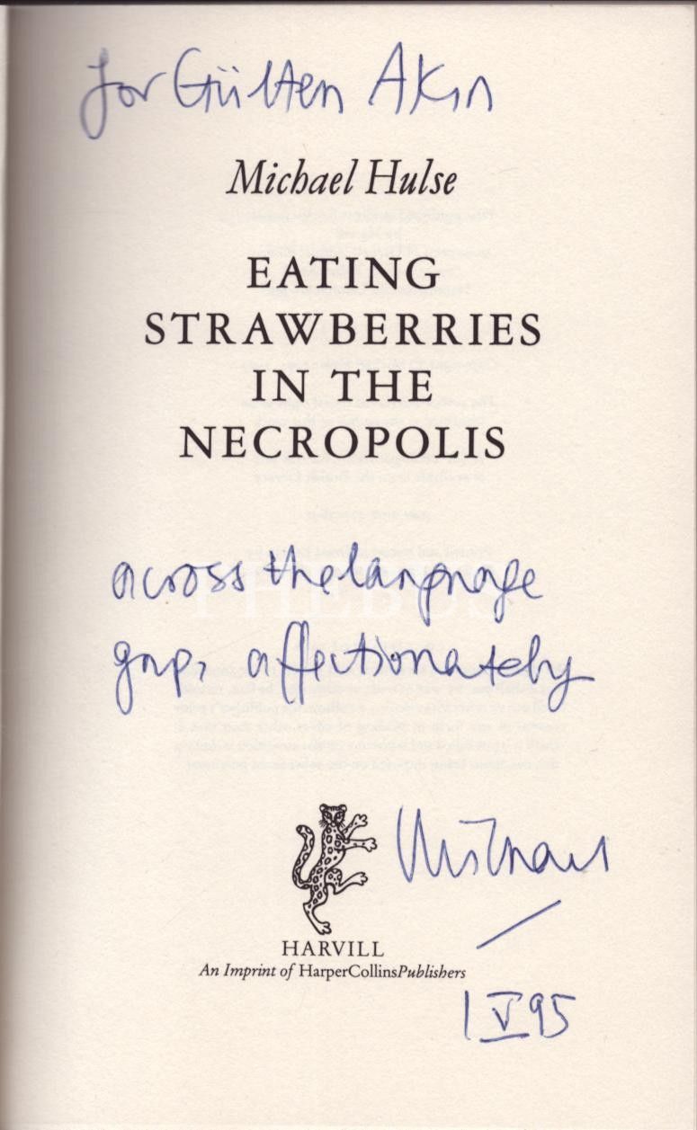 Micheal Hulse´den Gülten Akın´a ithaflı ve imzalı EATING STRAWBERRIES IN THE NECROPOLIS, Harper Collins Publishers, London - 1993, 63 sayfa, 13x21 cm