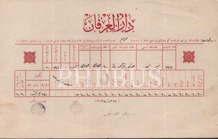 Darü´l-İrfan (İzmir) öğrencisi Münir Efendi´ye ait "aliyyü´l-a´lâ" dereceli not dökümü, 1928, 14x23 cm