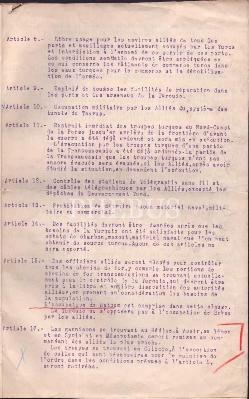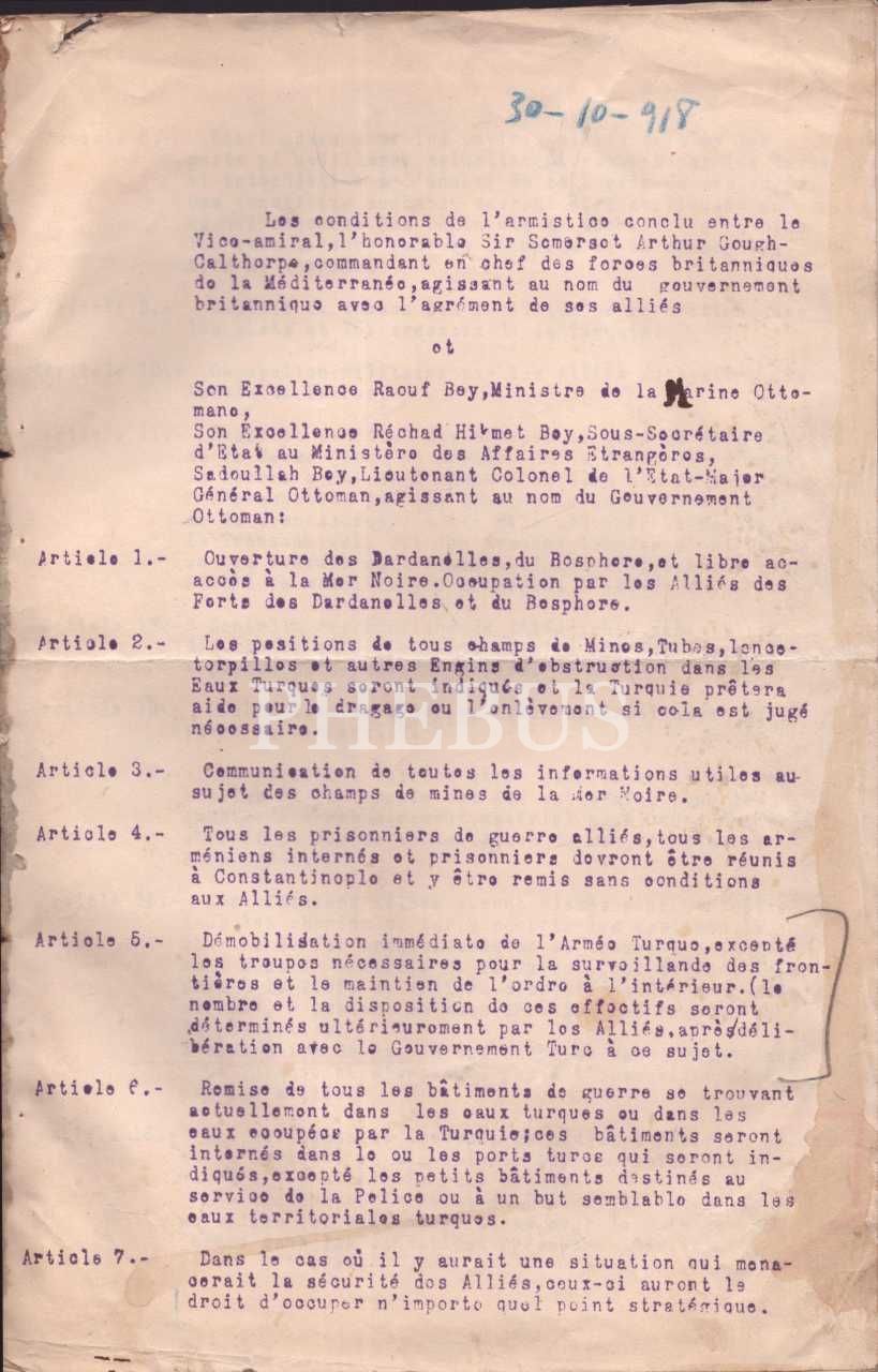 Galip Kemali Söylemezoğlu terekesinden: Türk Hükümeti adına Rauf Orbay, Reşad Hikmet ve Sadullah Bey ile Britanya Hükümeti adına Somerset Arthur Gough-Calthorpe arasında imzalanan ateşkes koşulları (İngilizce-Fransızca 11 sayfa), 30 Ekim 1918, 21x32 cm