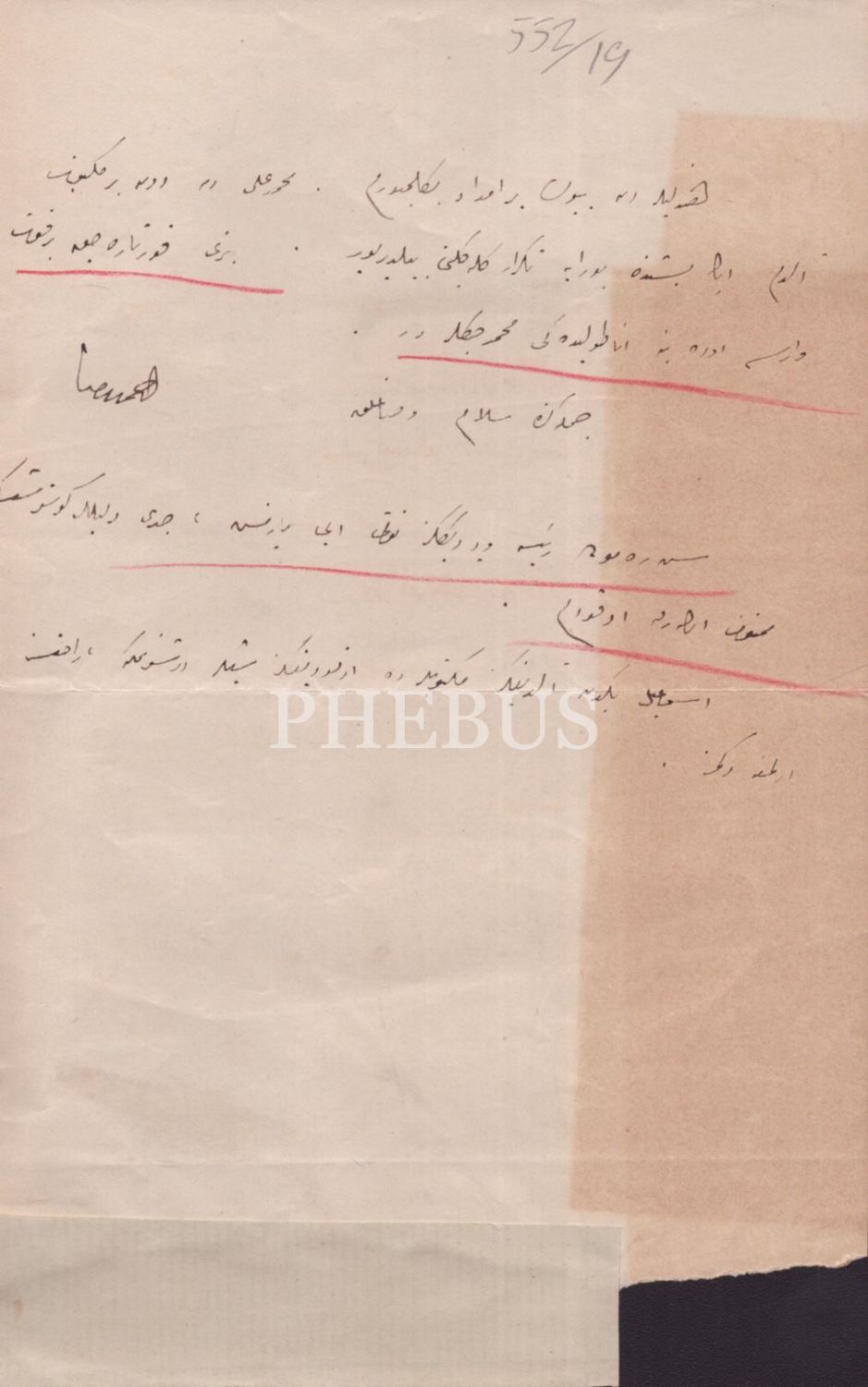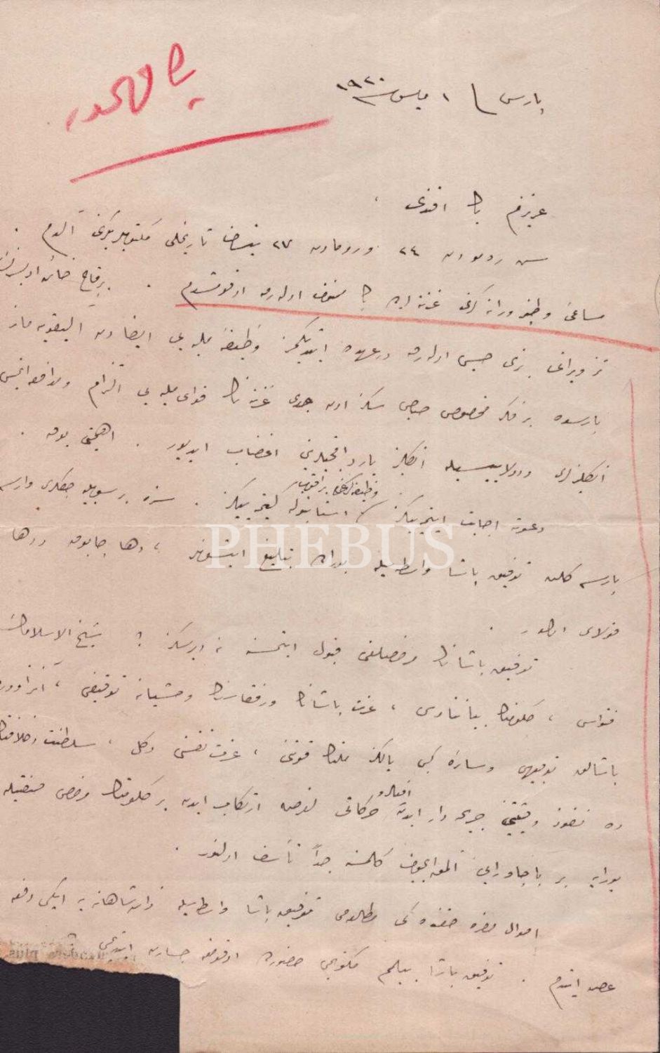Ahmed Rıza´nın Galip Kemali Söylemezoğlu´ya hitaben Paris´te kaleme aldığı mektup: "Bizi kurtaracak bir kuvvet varsa o da yine Anadolu´daki mehmedciklerdir", 1920, 13x21 cm