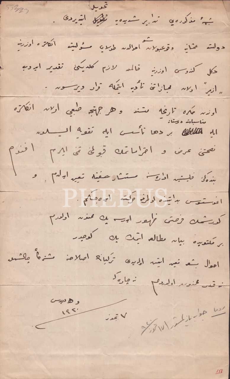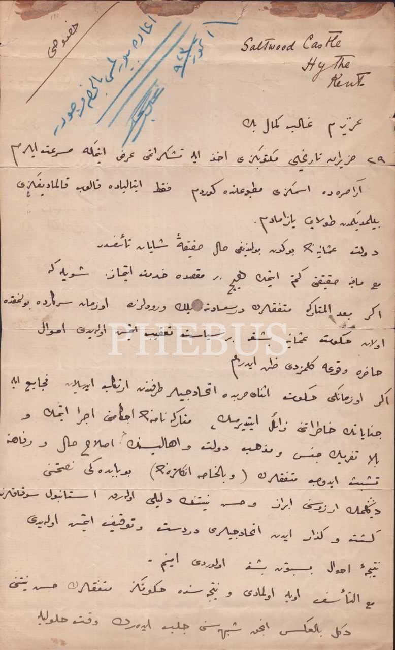 Filistin İdaresine müşteşar olarak atanan bir ismin Galip Kemali Söylemezoğlu´ya hitaben kaleme aldığı ve Osmanlı Hükümetinin İttihadçılar ve müttefiklere karşı izlediği siyaseti eleştirdiği mektup, 7 Temmuz 1920, 20x32 cm