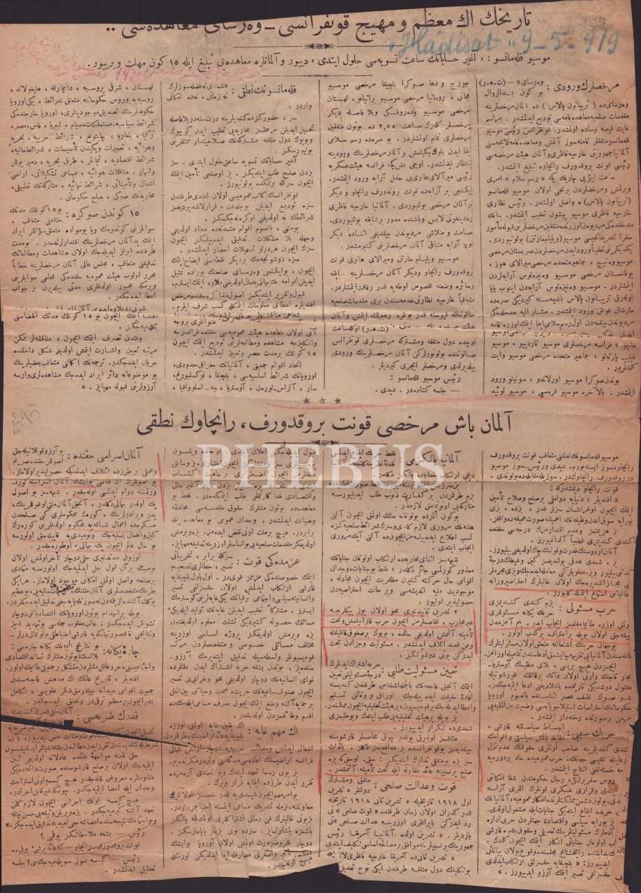 Galip Kemali Söylemezoğlu terekesinden, "Tarihin En Muazzam ve Müheyyic Konferansı- Versailles Muahedesi" başlıklı gazete kupürü, 1919, 28x38 cm