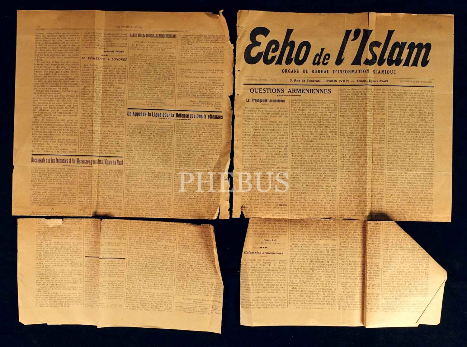 Pierre Loti´nin kaleminden "Ermeni Meselesi" ve Claude Farrere´in kaleminden "Küçük Asya [Anadolu] ve Barış" başlıklı makaleleri içeren Fransızca ECHO DE L´ISLAM, 20 Şubat 1920, 31x44 cm