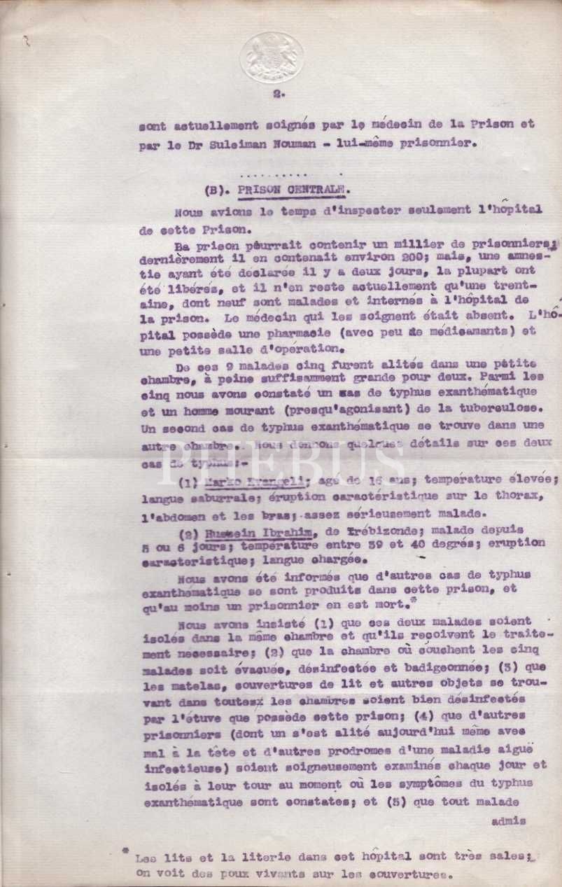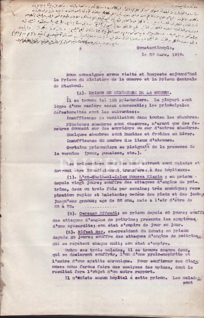 Raporun üst kısmında yer alan ve Galip Kemali Söylemezoğlu tarafından yazıldığı düşünülen Osmanlıca notta şu ifadeler yer almaktadır: "Mütareke vekayiinden: Rüesa-yı İttihad´ın tevkifinden sonra muhakeme-i aliyyelerine ibtidar edilmek üzere istintaklarına başlanmış idi. Bir gün Ferid Paşa beni çağırdı. Vükela-yı sabıkadan Şeyhülislam Musa Kâzım Efendi ile A´yan Reis-i Sabıkı Rifat Bey ve Karasu Efendi ziyade hasta olduklarından hastahaneye nakillerini taleb ediyor. İngiliz Fevkalade Komiserliğine gidiniz de bu zevatın iddia ve talebleri muhikk olub olmadığını anlamak üzere bulundukları mahalde muhtalat vir heyet-i tıbbiye tarafından muayene-i sıhhiyelerinin ifası ve neticesinin ba-rapor bana bildirilmesi hakkında teşebbüsatda bulununuz demiş idi. Derhal General ?´i gördüm ve Sadrazam Paşa´nın arzusunu tebliğ eyledim. Ertesi gün İngiliz Fransız ve İtalyan etıbbasından müteşekkil bir heyet tevkifhaneye ve salifü´z-zikr mevkufîni ziyaret ve muayene ederek suretini âtide ... derc eylediğim raporu vermişler"