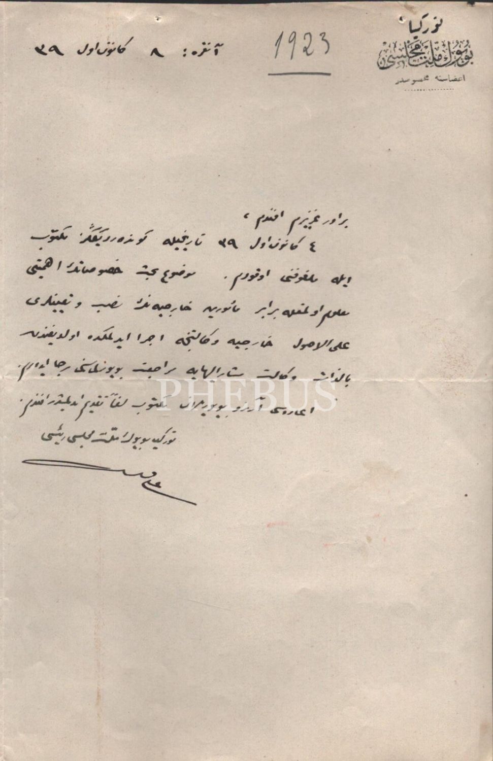 TBMM Reisi Ali Fethi Okyar tarafından, hariciye memurlarının tayinleri hakkında kaleme alınan ıslak imzalı mektup, Ankara 1339, 20x26 cm