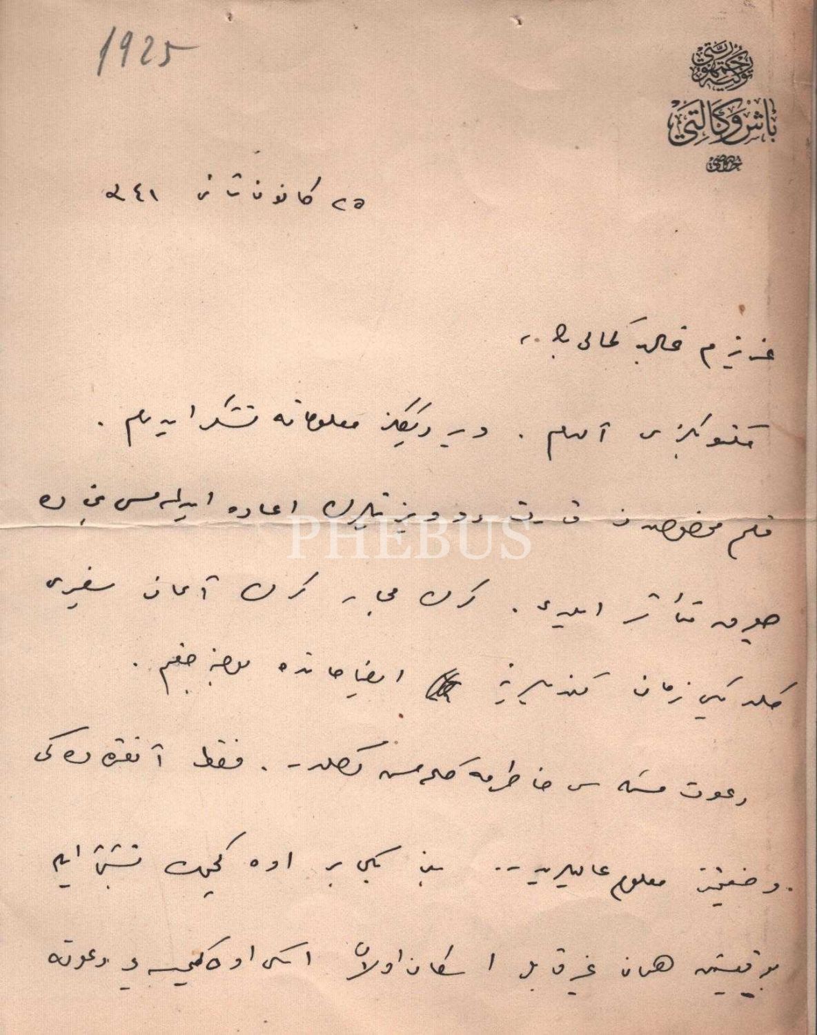 Ali Fethi Okyar´ın, T. C. Başvekaleti antetli kâğıtta Galip Kemali Söylemezoğlu´ya hitaben kaleme aldığı mektup, 25 Kanunusani 1341, 16x22 cm