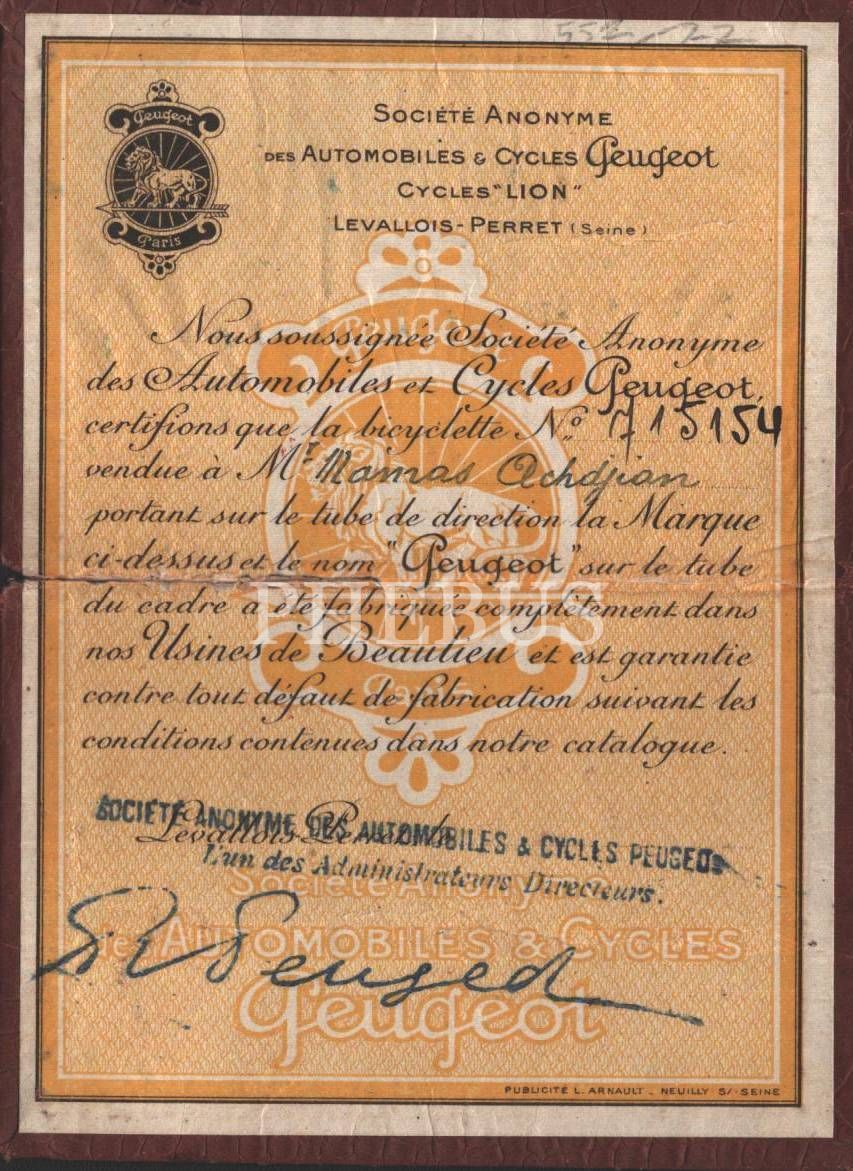 Peugeot Otomobil ve Bisiklet Anonim Şirketi´nden Fransızca bisiklet garanti belgesi, 11x15 cm