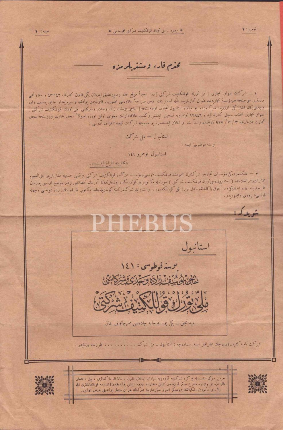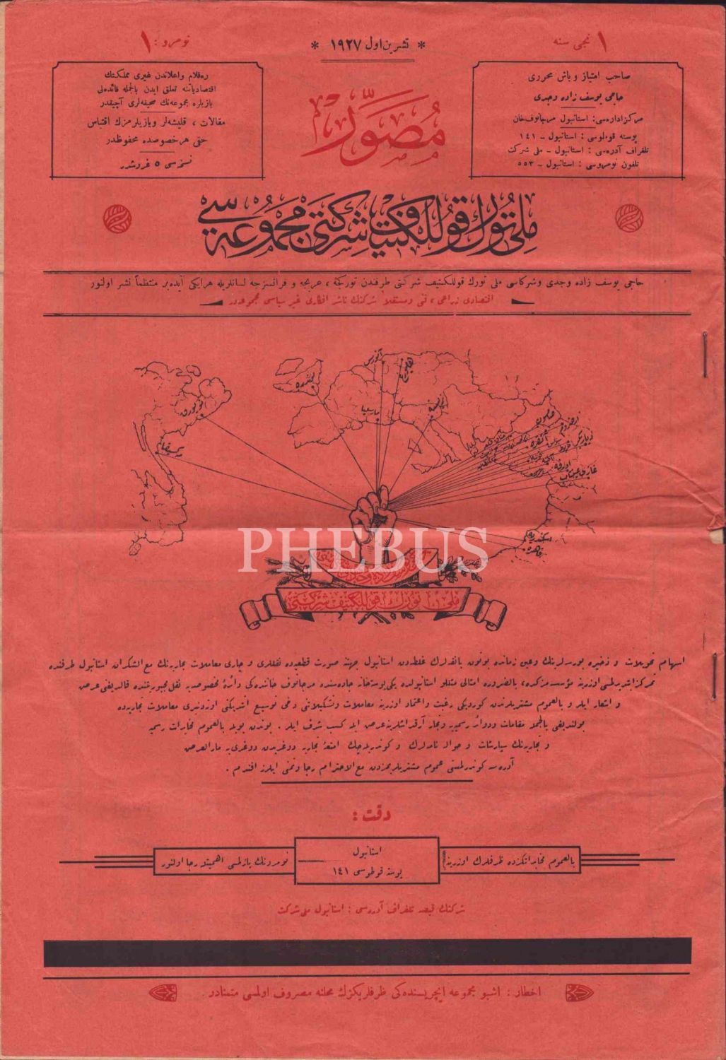 MUSAVVER MİLLÎ TÜRK KOLLEKTİF ŞİRKETİ MECMÛASI´nın ilk sayısı, Teşrinievvel 1927, 28x40 cm