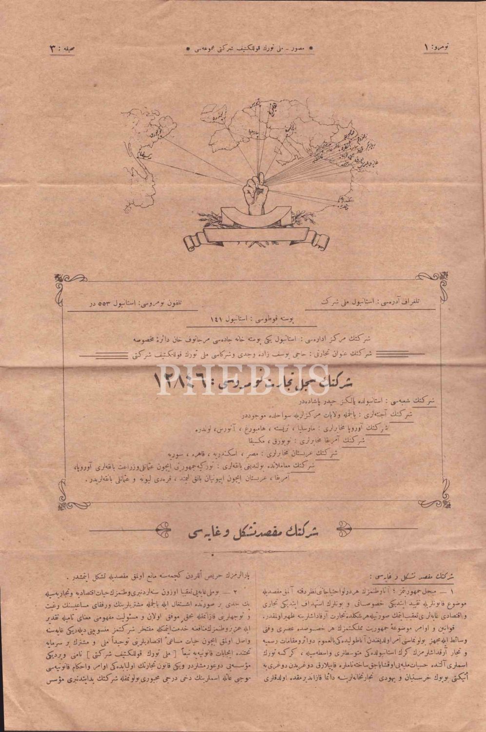 "Hacı Yusufzâde Vecdi ve Şürekası Millî Türk Kollektif Şirketi tarafından Türkçe, Arapça ve Fransızca lisanlarıyla her iki ayda bir muntazaman neşrolunur. İktisadi zirai, fenni ve müstakillen Şirketin naşir-i efkârı gayri siyasi mecmuadır."