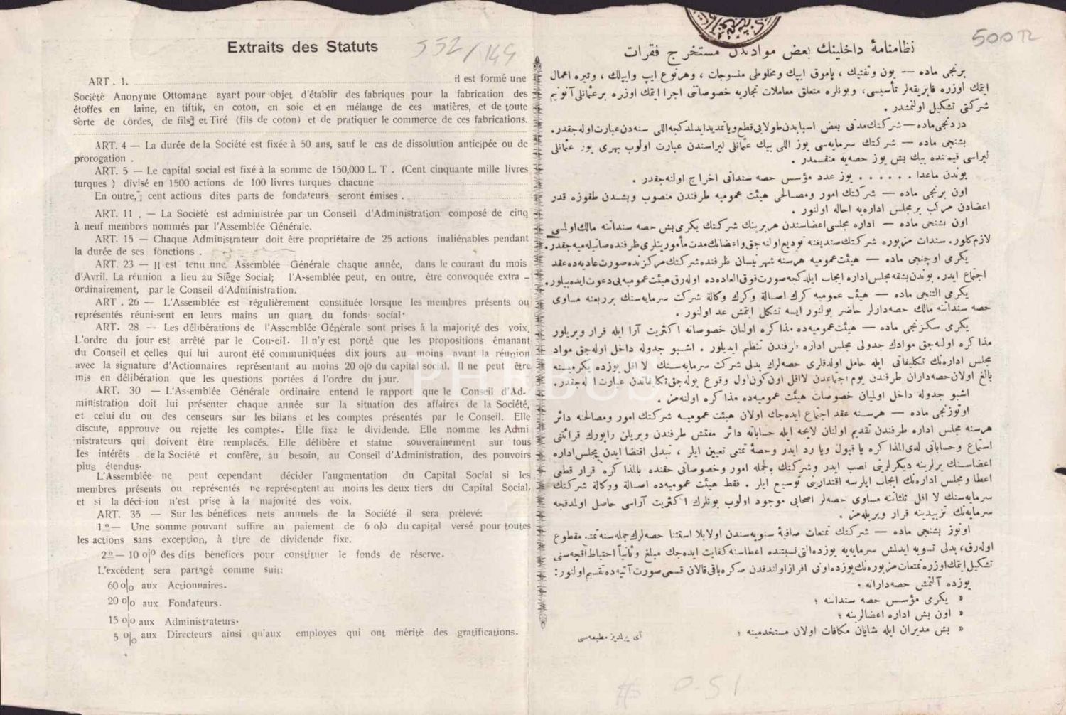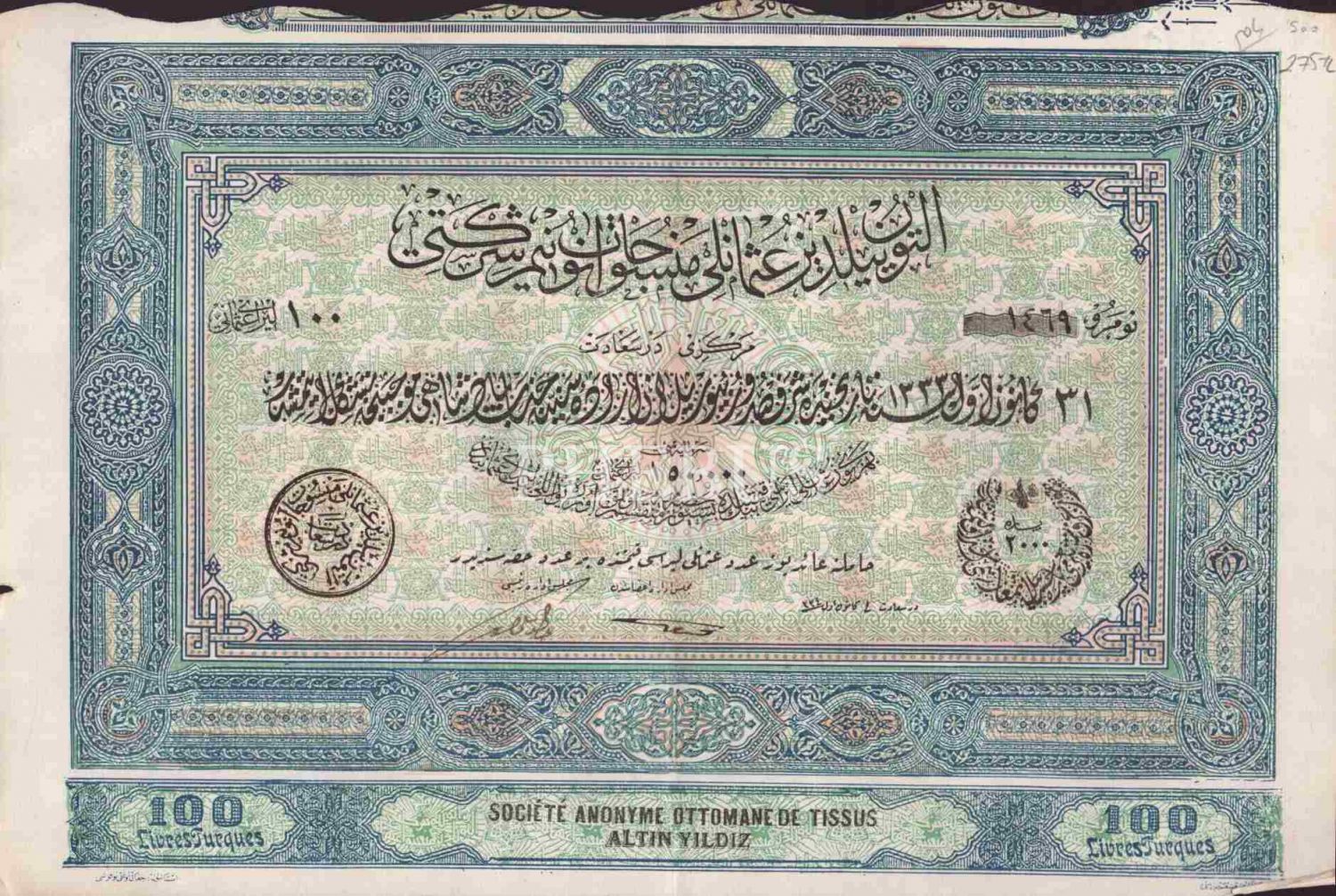 Altınyıldız Osmanlı Mensucat Anonim Şirketi´ne ait hisse senedi, 21x32 cm