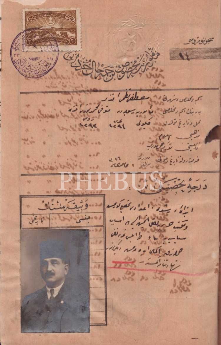 Trablusgarb, Bingazi ve Dersaadet´de memurluk yapmış Mustafa Nazmi Efendi´ye ait fotoğraflı sicil cüzdanı, 14x20 cm