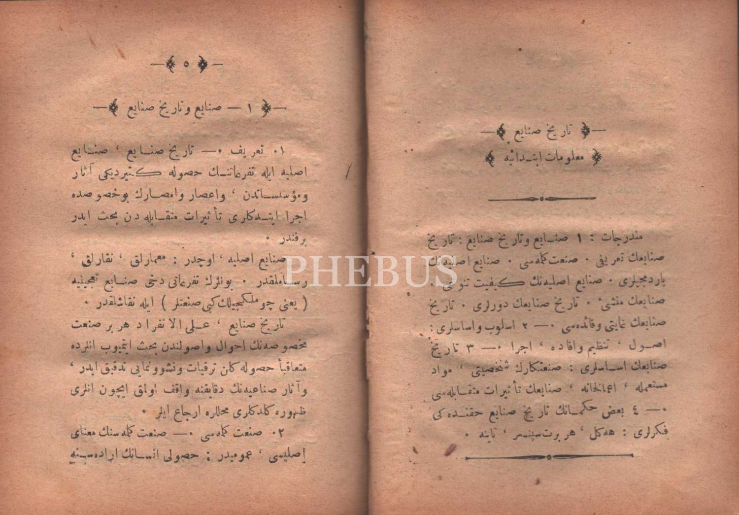 Osmanlı İmparatorluğunun son döneminde ilmiye sınıfına mensup önemli devlet adamlarından birisi olan, Mahmud Esat’ın İzmir İdadisi için ders kitabı olarak yazmış olduğu önemli eserlerden biridir. Kitapta, sanat ve sanayinin tarifi, sanayi tarihinin üslup ve esasları, Hegel, Herbert Spensır, Tayne gibi filozofların bu konulardaki görüşleri; tarih öncesi insan topluluklarının sanat ve imal faaliyetleri ile bunların arkeolojik kanıtları; İlk Çağ için Antik Mısır ve Yunan, Roma, Fenike, Beni İsrail, İran, Etrüryenin, Orta Çağ için Hristiyan, Bizans, Arap-İslam, Uzak Doğunun sanat, sanayi ve medeniyet eserleri anlatılmıştır.