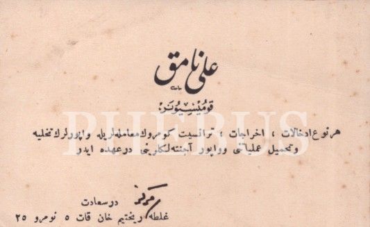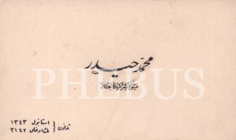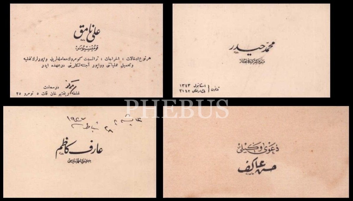 Osmanlıca 4 adet kartvizit; Hamid Aytaç ketebeli kartlar: Meyve Gümrüğü Tüccarı Mehmed Haydar, Kimya Mühendisi Arif Kazım, Dava Vekili Hasan Akif ve Komisyoncu Ali Nâmık