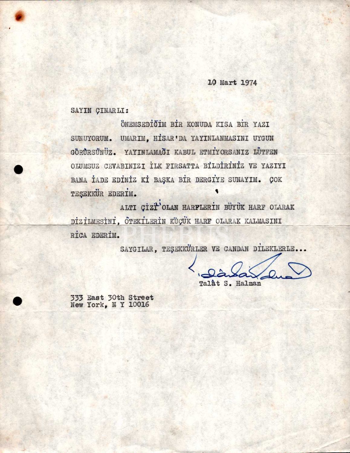 Kültür bakanlarından Talat Sait Halman´dan Hisar dergisi sahibi Mehmet Çınarlı´ya yazı teklifine dair mektup, 10 Mart 1974, 21x28 cm