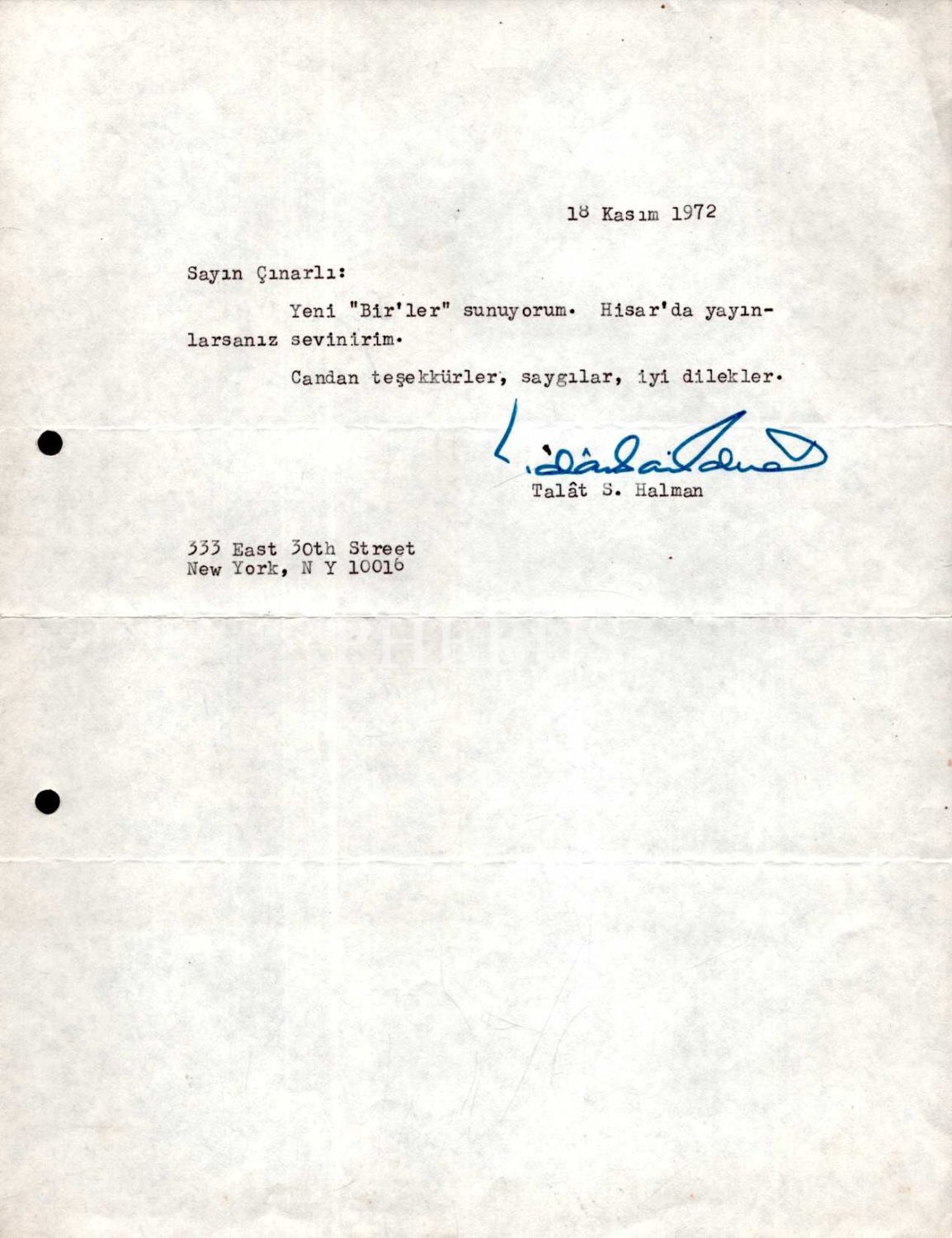 Kültür bakanlarından Talat Sait Halman´dan Hisar dergisi sahibi Mehmet Çınarlı´ya yazı teklifine dair mektup, 18 Kasım 1972, 21x28 cm